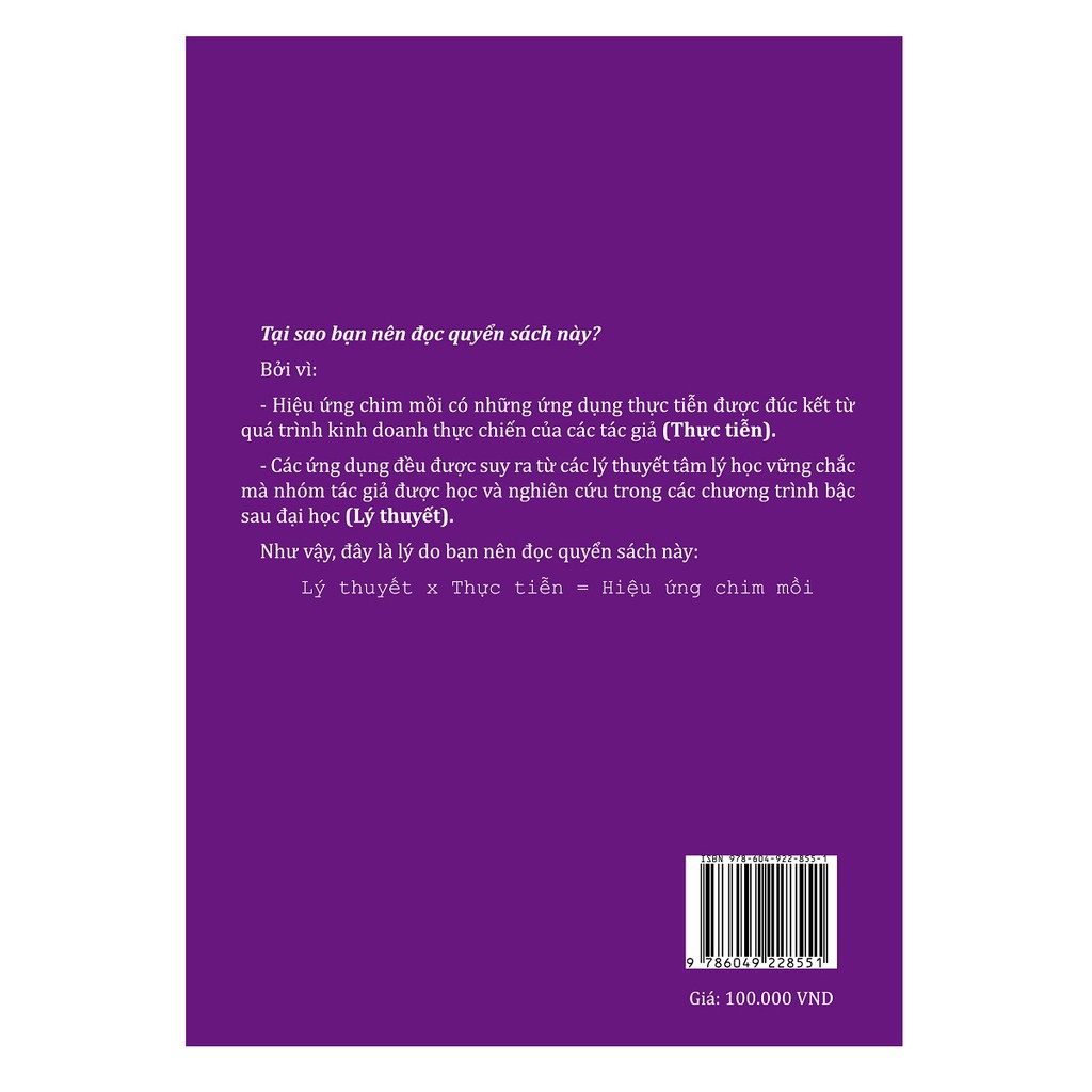 Bộ combo Hiệu ứng chim mồi Tập 1-2-3 trong hộp Ecoblader, với lời giới thiệu: Người ta hay coi lý thuyết và kinh nghiệm thực tiễn là hai thứ hoàn toàn đối nghịch nhau. Người đi theo hướng lý thuyết thường coi kiến thức kinh nghiệm là một thứ thiếu bền vững và không phổ quát, còn kẻ đi theo hướng thực hành thường gọi sách vở là lý thuyết suông, không dùng được. Thế nhưng, kể từ năm 2014, sau khi bắt đầu vừa tham gia nghiên cứu lý thuyết bậc sau đại học và viết các công trình khoa học, vừa tham gia bán hàng thực tiễn và ngã sấp mặt không biết bao nhiêu lần, chúng tôi phát hiện ra rằng lý thuyết và thực tiễn luôn song hành, gắn bó đến độ không thể tách rời: Người nắm lý thuyết nhưng không thực hành sẽ không thể biết những kiến thức của mình liệu có thể ứng dụng được trong thực tế hay không; ngược lại, người thực hành nhưng không có lý thuyết chống lưng sẽ không thể biết rằng liệu thành công của mình có cơ sở hay không, hay chỉ là may mắn và không thể áp dụng cho lần tiếp theo. Do vậy, quyển sách được cấu trúc thành các phần nhỏ với lý thuyết và ứng dụng đan xen. Mỗi hiện tượng hay kỹ thuật bán hàng đều được giải thích bằng lý thuyết, và mỗi lý thuyết đều có các ứng dụng minh họa, nhằm giúp các bạn độc giả có thể có kiến thức vững chắc và linh hoạt. Để thể hiện sự tôn trọng với các tác giả đi trước, mọi thông tin và số liệu lấy từ các nghiên cứu của các nhà khoa học khác đều được trích dẫn cụ thể, chính xác và ghi nguồn đầy đủ ở phần Tài liệu tham khảo. Một số thủ thuật ứng dụng là không chính thống và có thể không đúng chuẩn mực về đạo đức kinh doanh (thường gọi là thủ thuật “tà đạo”). Tuy nhiên, chúng tôi vẫn sẽ trình bày để các bạn độc giả có thể né tránh khi gặp phải—dưới vai trò người mua hàng. Chúng tôi viết sách này không nhằm biến bạn thành giáo sư, mà nhằm kích thích sự hứng thú của bạn với tâm lý học, một ngành khoa học có quá nhiều ứng dụng vào kinh doanh. Do vậy, các kiến thức phức tạp, chi tiết hơn mang tính hàn lâm được đưa vào các phần phụ lục để phục vụ các bạn có nhu cầu tìm hiểu để ứng dụng sâu. Nhờ đó, các kiến thức ở phần nội dung chính sẽ vẫn giữ được sự đơn giản, dễ hiểu và hấp dẫn của riêng mình. Hi vọng những kiến thức lý thuyết tích lũy trong quá trình nghiên cứu hàn lâm cùng với các ứng dụng tự suy từ kinh nghiệm tự doanh thực chiến của nhóm tác giả sẽ giúp cho công việc của bạn hiệu quả hơn. Chúc bạn có những phút giây thư giãn có ích cùng Hiệu ứng chim mồi!