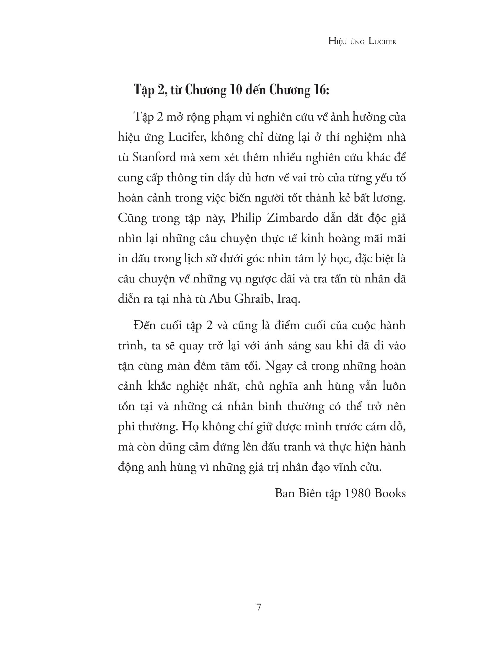 Chúng ta cũng sẽ vượt ra ngoài môi trường thí nghiệm để tìm hiểu về hiệu ứng Lucifer trong thực tế, đặc biệt là câu chuyện về những vụ ngược đãi và tra tấn khủng khiếp các tù nhân tại nhà ngục Abu Ghraib, Iraq. Chúng ta sẽ đào sâu vào địa điểm, con người và hoàn cảnh để đưa ra kết luận về các nguyên nhân dẫn đến những hành vi tàn bạo xuất hiện trong “bộ ảnh chiến tích” mà những người lính đã ghi lại trong quá trình hành hạ tù nhân.