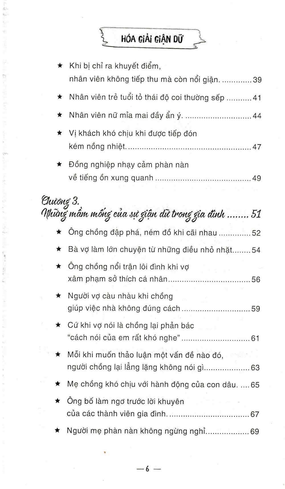 - Những phiền phức trong cuộc sống thường nhật Mỗi ngày một người bình thường dường như phải đối mặt với rất nhiều những cơn giận dữ từ nhiều nguồn khác nhau. Rất may trong cuốn sách này, bác sĩ tâm lý Fujii Masako sẽ chỉ ra cho độc giả cách thức hóa giải những giận dữ mà bạn có thể phải đối mặt. Tác giả Fujii Masako cho biết có vô số lý do khiến một người trở nên giận dữ, tuy nhiên có một điểm chung duy nhất, đó là người tức giận đang gặp phải khó khăn, và chính vì không xử lý được vấn đề nên họ chỉ còn cách thể hiện bằng sự tức giận. Do đó, từ nay nếu gặp ai đó đang giận dữ, bạn hãy tự nhủ rằng họ đang gặp khó khăn. “Tôi là tôi. Bạn là bạn”. Nếu chúng ta có thể phân biệt rạch ròi ranh giới giữa bản thân và người khác thì việc chúng ta bị cảm xúc của họ chi phối, hoặc trút giận lên người khác chắc chắn sẽ giảm đáng kể. Nếu vẫn quá để tâm đến chuyện đó thì tốt hơn hết, bạn hãy xem xem liệu mình có thể giúp họ điều gì không. Ẩn chứa phía sau cơn giận dữ là vô vàn các nguyên do, và đó chính là điều mà tác giả cuốn sách cung cấp cho độc giả trong cuốn sách này. Hy vọng rằng khi phải đối mặt với sự tức giận của ai đó, bạn có thể đối phó một cách khéo léo và hiệu quả .