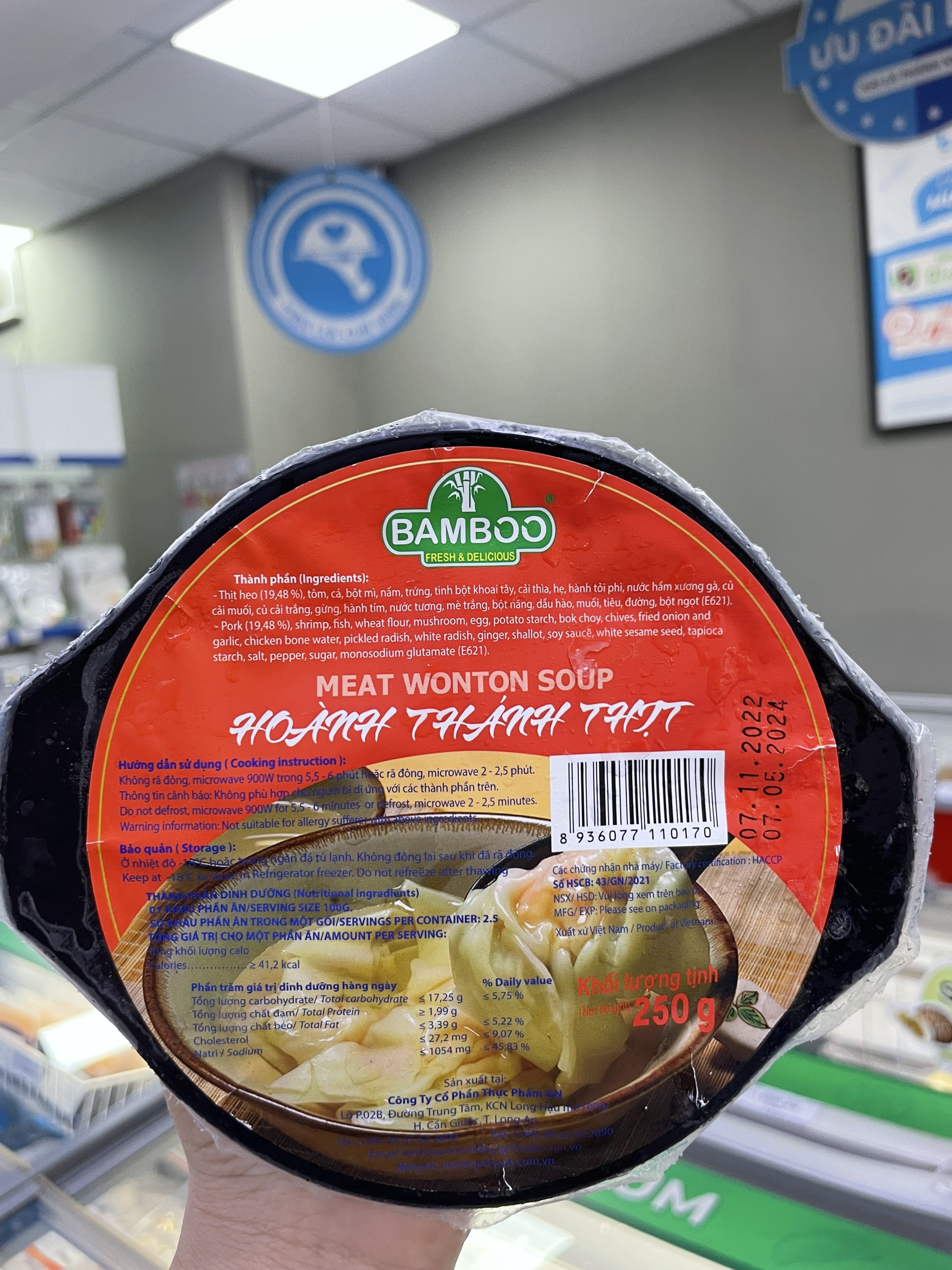 Với sản phẩm tươi sống, trọng lượng thực tế có thể chênh lệch khoảng 10%. ĐỊNH LƯỢNG: (15g/cái x 6 cái/gói) + (110g soup + 50g rau) THÀNH PHẦN: Thịt heo, tôm, nấm đông cô,
