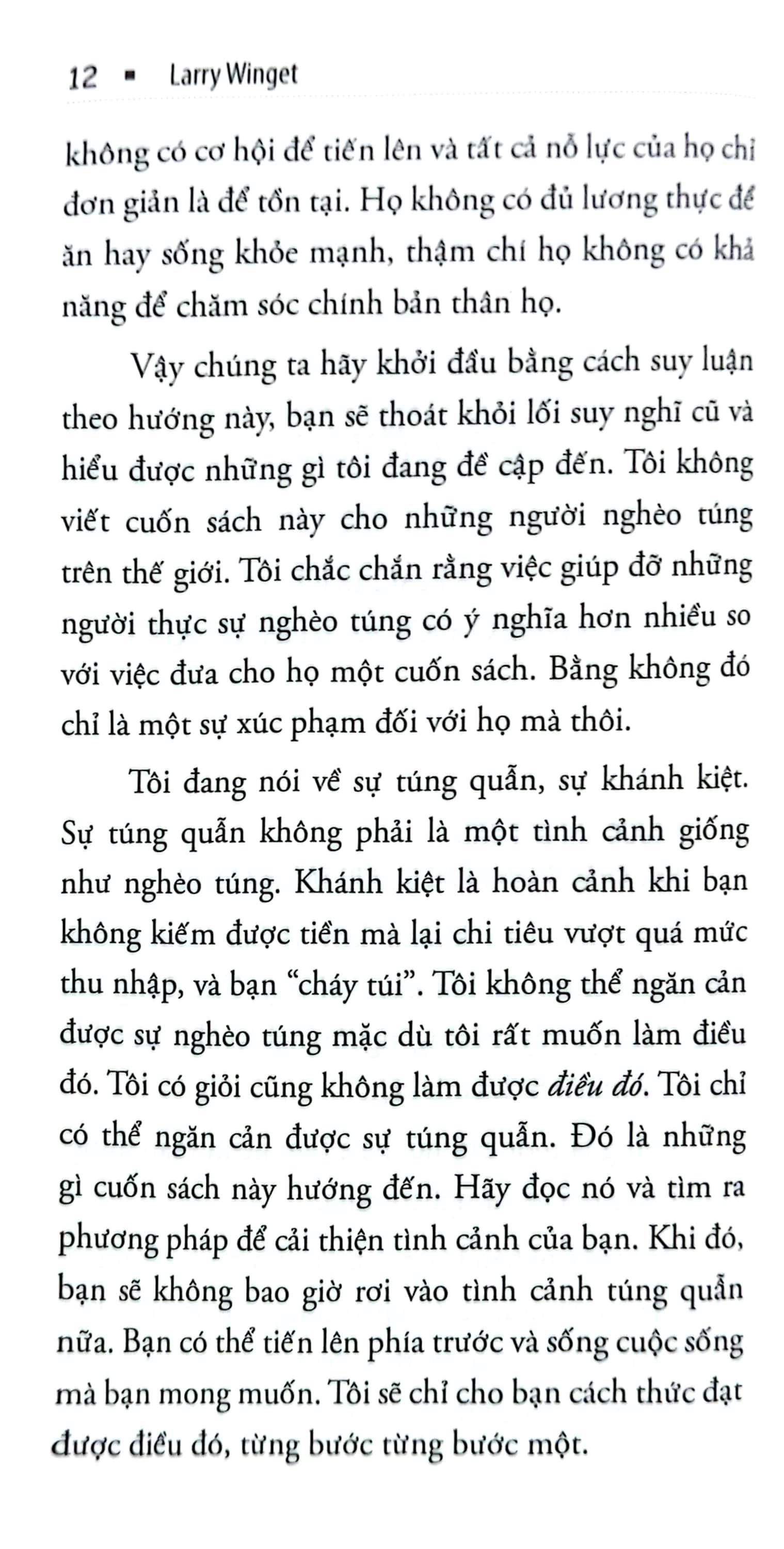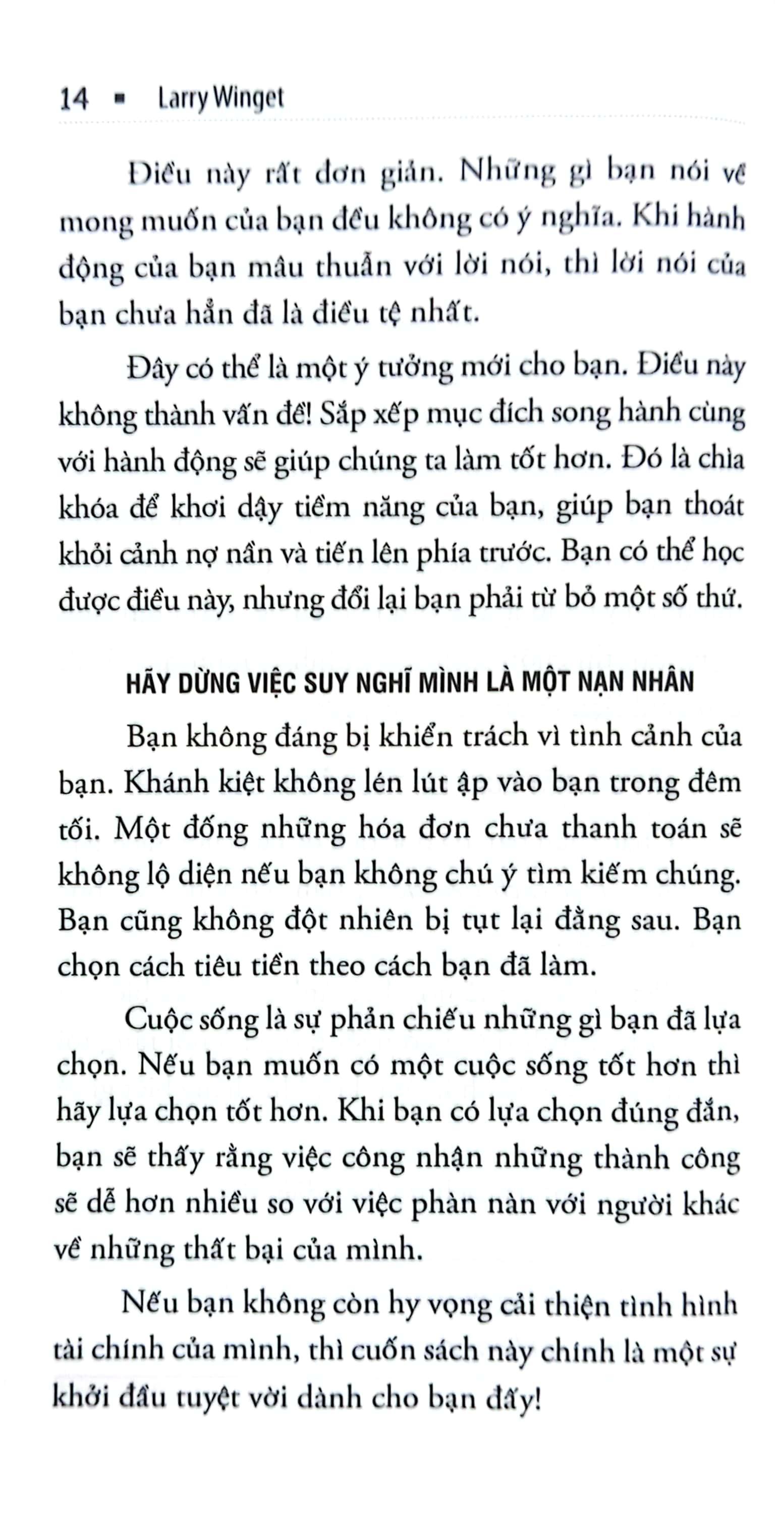 Học Cách Tiêu Tiền Hẳn bạn sẽ ngạc nhiên với tiêu đề này? Học cách tiêu tiền, bạn từng nghe lần nào chưa? Mọi người vẫn cho rằng tiêu tiền là một việc hết sức tự nhiên và dễ nhất trần đời. Chúng ta chi tiền cho những nhu cầu cá nhân: thực phẩm, quần áo, giải trí,… Quan trọng là bạn có tiền hay không? Bạn kiếm tiền như thế nào? Và, làm thế nào để kiếm được thật nhiều tiền? Khi đã có tiền thì việc tiêu tiền thật đơn giản!!! Nếu bạn từng suy nghĩ như vậy thì việc bạn “vung tay quá trán” cũng là điều dễ hiểu. Tiền bạc luôn là một trong những vấn đề quan trọng của cuộc sống. Có thể, tiền không là mục tiêu hàng đầu đối với bạn, nhưng tiền lại có tác động đến hầu hết mọi khía cạnh trong cuộc sống, những ước mơ, dự định trong tương lai của bạn đều ít nhiều chịu sự chi phối của đồng tiền. Nghe có vẻ to tát quá phải không bạn? Vậy hãy nghĩ đến những việc đơn giản hơn như mua đồ ăn, quần áo, xăng xe; đi chơi, đi xem phim, đi ăn nhà hàng; theo học bậc đại học, sách vở, dụng cụ học tập… tất cả đều cần có tiền. Tiêu tiền là một hành động quá đỗi bình thường, nhưng không có nghĩa là mọi người đều đã biết cách tiêu tiền. Ông chỉ ra rằng chính cách chi tiêu cùng lối suy nghĩ của mọi người về vấn đề tiền bạc, chứ không phải nguyên nhân nào khác, đã khiến họ lâm vào tình cảnh “cháy túi” và nợ nần chồng chất. Trong cuốn sách này, Larry Winget đưa ra những phương pháp rõ ràng, cụ thể và dễ áp dụng để kiểm soát chi tiêu. Đó là những việc làm hết sức đơn giản nhưng mang lại hiệu quả bất ngờ, như bỏ truyền hình cáp, hạn chế đi ăn nhà hàng, dọn dẹp nhà cửa,… hay những việc làm mang tính dài hạn như lên kế hoạch chi tiêu hàng tháng, chuyển sang một căn hộ mới, dạy dỗ con cái về tài chính… Xen kẽ là những bài tập thực hành nho nhỏ, những câu chuyện, ví dụ đơn giản và gần gũi, giúp người đọc hiểu rõ hơn về thực trạng tài chính của bản thân và có thêm động lực để thoát khỏi tình trạng khó khăn. Bạn đang có một công việc kiếm sống nhưng bạn gặp khó khăn trong việc vươn lên một tầm cao mới? Bạn mong muốn tự chủ về tài chính? Bạn đang ngập trong đống nợ nần và loay hoay tìm cách thoát ra? Bạn chi nhiều hơn thu và không thể tìm ra cách để chấm dứt? Học cách tiêu tiền chính là giải pháp cho những vấn đề đó.