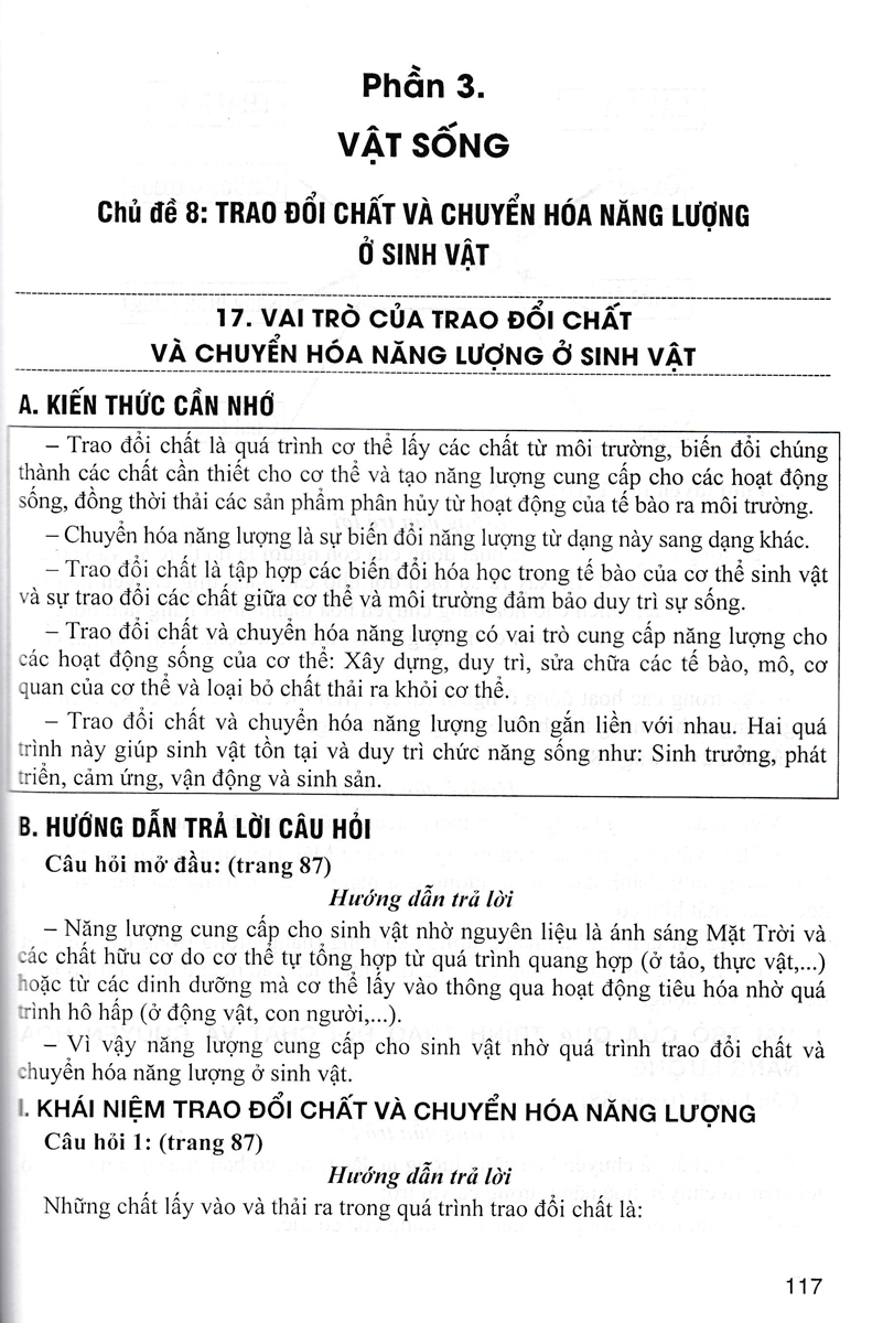 Nội dung của cuốn sách sẽ hệ thống lại kiến thức trọng tâm cần nhớ để học sinh hiểu được nội dung bài học, tiếp đó sẽ hướng dẫn hoặc gợi ý các em trả lời các câu hỏi của bài học. Với mong muốn các em có khả năng tư duy, sáng tạo, nhóm tác giả đưa thêm các câu hỏi phát triển năng lực nhằm phát huy tính thích tìm tòi, khám phá của học sinh giúp các em phát triển năng lực và phẩm chất, mở rộng tầm hiểu biết về thế giới tự nhiên.