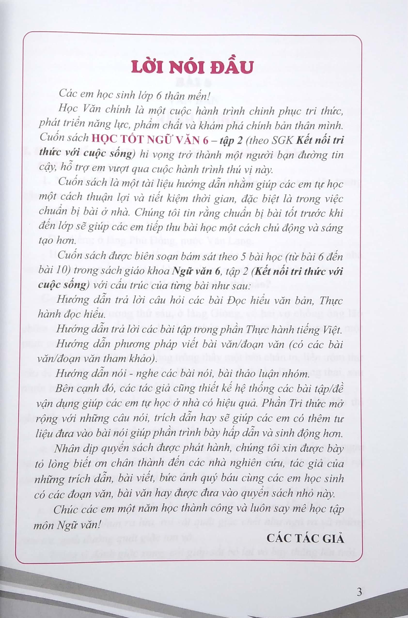Học Văn chính là một cuộc hành trình chinh phục tri thức, phát triển năng lực, phẩm chất và khám phá chính bản thân mình. Cuốn sách HỌC TỐT NGỮ VĂN 6 – tập 2 (theo SGK Kết nối tri thức với cuộc sống) hi vọng trở thành một người bạn đường tin cậy, hỗ trợ em vượt qua cuộc hành trình thú vị này.