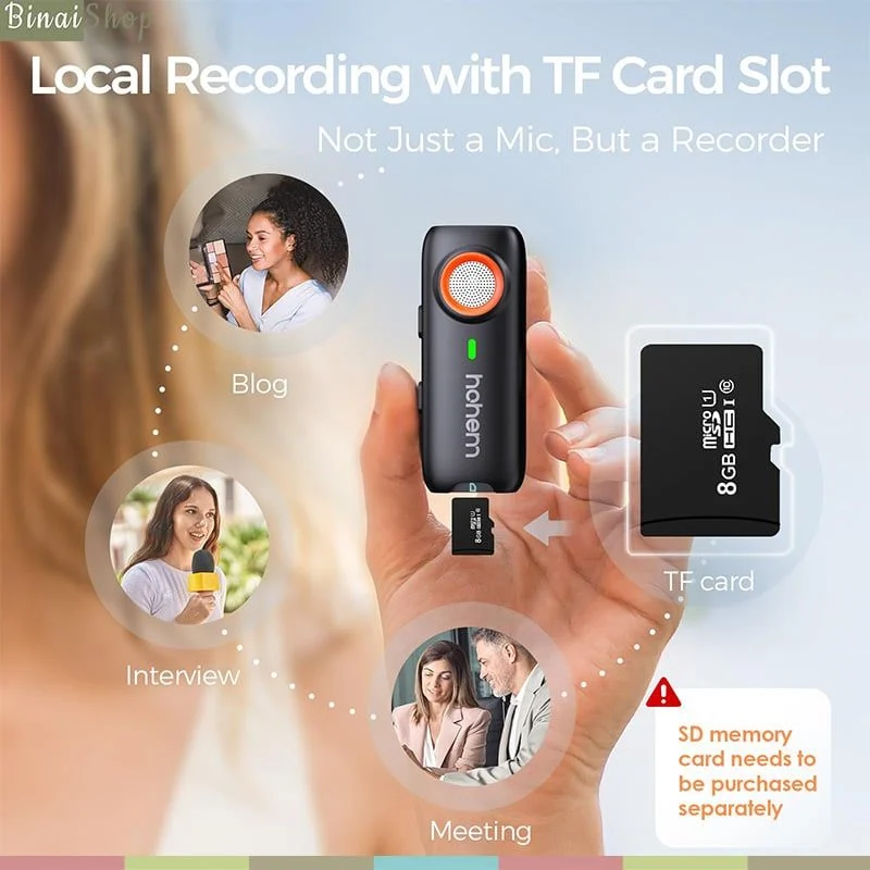 Mua tại Tiktok- Mic cài áo không dây Hohem MIC-01 được thiết kế nhỏ gọn, siêu nhẹ, chắc chắn, tinh tế mang lại sự tiện lợi, chip khử tiếng ồn DSP hiệu suất cao, kết nối dễ dàng nhanh chóng các điện thoại thông minh với bộ thu RX trang bị cổng Type-C(Android) và cổng Lightning (IOS), micro đa hướng 360 độ sử dụng dài tần 2.4GHz hoạt động ổn định trong phạm vi lên đến 100m, trang bị khe cắm thẻ TF trên TX, phù hợp với phát trực tiếp, vlogger, phỏng vấ TÍNH NĂNG CƠ BẢN