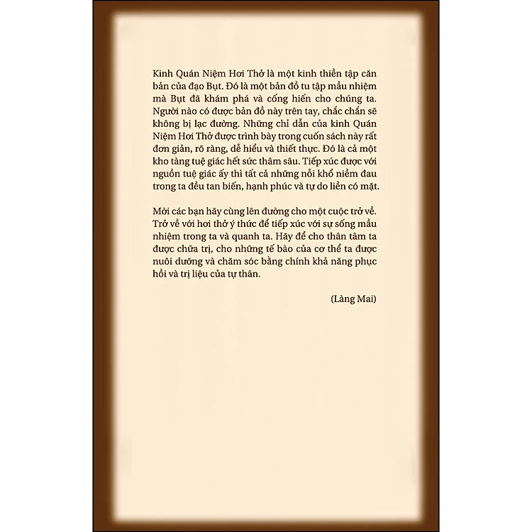 Kinh Quán Niệm Hơi Thở là một kinh thiền tập căn bản của đạo Bụt. Đó là một bản đồ tu tập mầu nhiệm mà Bụt đã khám phá và cống hiến cho chúng ta. Người nào có được bản đồ này trên tay, chắc chắn sẽ không bị lạc đường. Những chỉ dẫn của kinh Quán Niệm Hơi Thở được trình bày trong cuốn sách này rất đơn giản, rõ ràng, dễ hiểu và thiết thực. Đó là cả một kho tàng tuệ giác hết sức thâm sâu. Tiếp xúc được với nguồn tuệ giác ấy thì tất cả những nỗi khổ niềm đau trong ta đều tan biến, hạnh phúc và tự do liền có mặt.