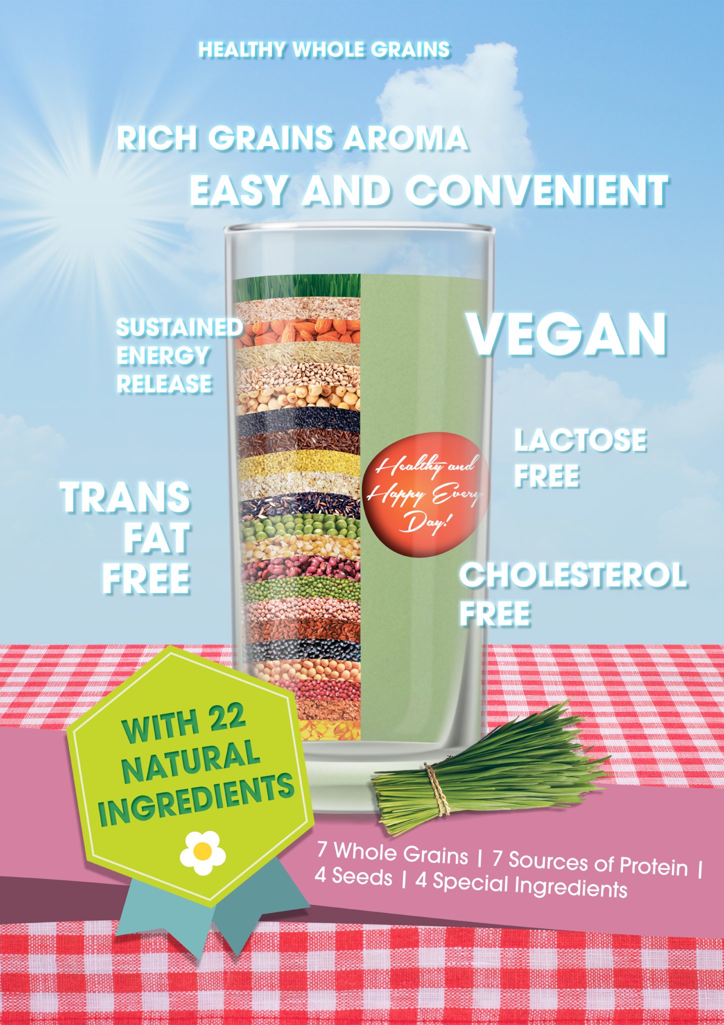 GỒM 22 DƯỠNG CHẤT: Gạo lứt, bắp, đậu nành, gạo đỏ, đậu đỏ, đại mạch, đậu xanh (đậu mung), đậu garbanzo, đậu nâu, hạnh nhân, đậu co ve, hạt sen, đậu đen, lúa mì trắng, hạt kê hữu cơ, mè đen, gạo nếp, hạt lanh hữu cơ, bột yến mạch, mầm lúa mì, vỏ hạt mã đề, lecithin đậu nành.
