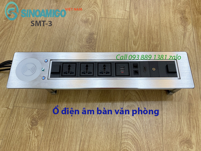 Sản phẩm: ổ cắm âm bàn SMT-3 là một trong những dòng sản phẩm mới nhất mà SINOAMIGO phát triển và tung ra thị trường với nhiều tính năng mang đến cho người dùng sự tiện lợi và sang trọng nhất như mở nắp hộp bằng nút cảm ứng tự động thay vì nút cơ như các model thông thường khác. Hộp âm bàn văn phòng SMT-3 còn trang bị công nghệ sạc không dây để sạc máy tính bảng, điện thoạ các dòng máy được trang bị công nghệ sạc không dây này.