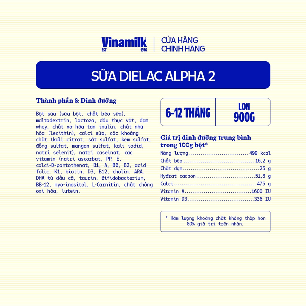 Mua tại TiktokSữa bột Vinamilk Dielac Alpha 2 - Hộp thiếc 900g (cho bé từ 6 - 12 tháng tuổi) - Sữa cho trẻ sơ sinh • Dielac Alpha 2 là sản phẩm dinh dưỡng công thứcđược sử dụng thay thế hoàn toàn hoặc một phần bữa ăn cho trẻ không có hoặc thiếu sữa mẹ. Giai đoạn dưới 1 tuổi, trẻ phát triển và tăng trưởng rất nhanh về cân nặng và não bộ. Nếu cơ thể trẻ được cung cấp đầy đủ dinh dưỡng sẽ tăng cân, khỏe mạnh và phát triển não bộ tốt hơn. • Dielac Alpha 2 với công thức 3 trong 1cung cấp đầy đủ các dưỡng chất thiết yếu hỗ trợ phát triển não bộ, giúp tăng cân, chiều cao và tăng sức đề kháng. Sản phẩm được nghiên cứu đáp ứngtiêu chuẩn thực phẩm Quốc tế - Codex và Nhu cầu dinh dưỡng khuyến nghị RNI của Bộ Y Tế Việt Nam.