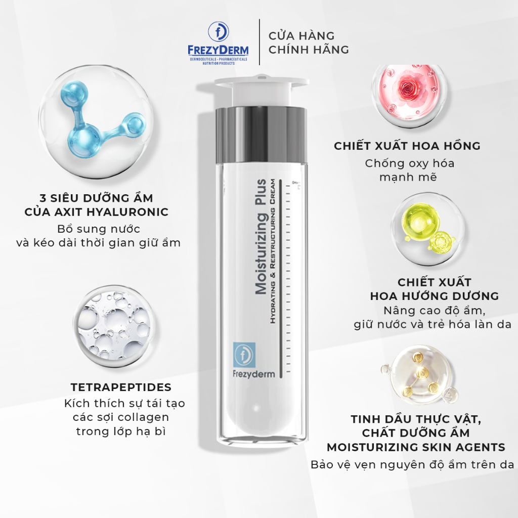 Kem dưỡng ẩm, chống lão hóa Frezyderm Moisturizing Plus Cream là giải pháp hoàn hảo cho những làn da từ khô đến rất khô. Sản phẩm được chiết xuất từ thực vật tích hợp 3 thành phần siêu dưỡng ẩm của axit hyaluronic giúp nuôi dưỡng làn da mịn màng, căng bóng như mong đợi. THÔNG TIN THƯƠNG HIỆU Tên sản phẩm: Kem dưỡng ẩm trẻ hóa da Frezyderm Moisturizing Plus Cream 50ml Tên thương hiệu: Frezyderm Nơi sản xuất: Hy Lạp Dung tích: 50ml Hạn sử dụng: 3 năm kể từ ngày sản xuất Thông tin ngày sản xuất: Xem trên bao bì sản phẩm --- THÀNH PHẦN - 3 thành phần siêu dưỡng ẩm của axit hyaluronic: Bổ sung nước và kéo dài thời gian giữ ẩm. Đem đến sự mềm mại, đàn hồi cho làn da. Đồng thời, cải thiện nếp nhăn mờ trên bề mặt da. thúc đẩy sự sản xuất collagen và protein cho màng tế bào. - Tetrapeptides: Kích thích sự tái tạo các sợi collagen trong lớp hạ bì. Cũng như tăng lượng axit hyaluronic trong da. Giúp săn chắc da bằng cách giữ ẩm cho lớp biểu bì. - Chiết xuất hoa hồng: Ngoài các vitamin nhóm B, D, E, K, trong hoa hồng còn có hàm lượng lớn vitamin C. Đặc biệt là Eugenol. Một chất có đặc tính chống oxy hóa mạnh mẽ. Không chỉ cung cấp độ ẩm cho da, chiết xuất này còn làm mát dịu da rất tốt. - Chiết xuất hoa hướng dương: Chứa rất nhiều Vitamin E và các chất chống oxy hóa. Cùng vitamin A, C, D…và các carotenoid giúp tạo thành “hàng rào” bảo vệ da. Nâng cao độ ẩm và giữ nước cho da một cách tối ưu. Giúp trẻ hóa làn da và gia tăng sự tươi sáng. - Tinh dầu thực vật, chất dưỡng ẩm moisturizing skin agents: Bảo vệ vẹn nguyên độ ẩm trên da. Và tối ưu màng lipids. --- CÔNG DỤNG - Cung cấp độ ẩm và giữ ẩm chuyên sâu ở 3 cấp độ. - Cung cấp nước, dưỡng chất. và duy trì độ ẩm cho làn da luôn mềm mịn, co giãn và đàn hồi tốt. - Xóa mờ nếp nhăn, đẩy lùi lão hóa. - Cải thiện làn da kém sức sống. Đem đến vẻ rạng ngời tuyệt vời. - Làm dịu da hiệu quả. - Tăng cường sản sinh collagen, elastin chống lão hóa, làm đều màu da. --- ĐỐI TƯỢNG SỬ DỤNG Kem dưỡng ẩm trẻ hóa da Frezyderm Moisturizing Plus Cream thích hợp với: - Những ai sở hữu da khô, rất khô da. Thường xuyên nứt nẻ, bong tróc. - Da khô ở 1 số vùng như trán, quanh mũi,… - Da sau các thủ thuật thẩm mỹ như: lột (peel), laser không xâm lấn, siêu mài mòn,… - Da xuất hiện các tình trạng nếp nhăn, rãnh nhăn, chân chim,… - Những bạn đang tìm kiếm sản phẩm dưỡng ẩm hằng ngày. - Với những phụ nữ trên 30 tuổi, đây là lựa chọn “chân ái”. --- HƯỚNG DẪN SỬ DỤNG
