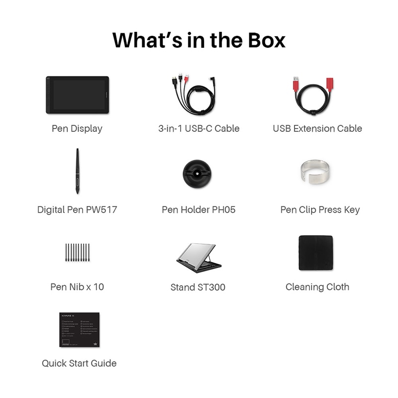 - Có 3 màu tuỳ chọn : đen, tím, xanh rêu. hàng có sẵn tại Tứ Gia Computer - 123 Thuỵ Khuê (www.TuG) Bảng vẽ LCD Huion Kamvas 13 (Android), màn hình IPS 13.3in, full HD 1920×1080, tỷ lệ 16:9, độ phân giải bảng vẽ 5080lpi, bút vẽ PW517 không pin 8192 mức lực nhấn, cảm ứng ±60° nghiêng, kết nối USB-C. Hai chế độ sử dụng, bảng vẽ/bảng vẽ LCD. - Có 3 màu tuỳ chọn : đen, tím, xanh rêu. hàng có sẵn tại Tứ Gia Computer - 123 Thuỵ Khuê (www.TuG) Màn hình IPS, 13.3in, tỷ lệ 16:9 Vùng hiển thị 293.76 × 165.24mm Màu hiển thị 16.7 triệu màu (8 bit màu) Phổ màu 120% sRGB Độ phân giải HD 1920x1080 Độ trễ 25ms Độ tương phản 1000:1 Độ sáng 220cd/m2 Bút vẽ PW517, cảm ứng từ, không pin Tốc độ truyền 266pps Lực nhấn bút 8192 Cảm ứng nghiêng ±60° Độ cảm ứng 10mm Express Keys 8 phím tắt lặp trình được Video in USB-Type C Kết nối USB Kích cỡ 366.5 x 217.4 x 11.8mm Trọng lượng 980g Nguồn cấp điện 5v DC Công suất tiêu thụ =< 7W Điện áp Input 100-240 VAC, 50/60 Hz Hệ điều hành Win7 - Mac OS 10.12 - Android 6.0 hoặc cao hơn Trong hộp gồm có : • Bảng vẽ Kamvas 13 • Bút cảm ứng PW517 • Cáp 3 trong 1 • Bộ cấp nguồn, đầu cắm • Kẹp gắp ngòi bút • 10 ngòi dự phòng • Đế cắm bút • Vải lau màn hình • Hướng dẫn nhanh Màn hình IPS, 13.3in, tỷ lệ 16:9 Vùng hiển thị 293.76 × 165.24mm Màu hiển thị 16.7 triệu màu (8 bit màu) Phổ màu 120% sRGB Độ phân giải HD 1920×1080 Độ trễ 25ms Độ tương phản 1000:1 Độ sáng 220cd/m2 Bút vẽ PW517, cảm ứng từ, không pin Tốc độ truyền 266pps Lực nhấn bút 8192 Cảm ứng nghiêng ±60° Độ cảm ứng 10mm Express Keys 8 phím tắt lặp trình được Video in USB-Type C Kết nối USB Kích cỡ 366.5 x 217.4 x 11.8mm Trọng lượng 980g Nguồn cấp điện 5v DC Công suất tiêu thụ =< 7W Điện áp Input 100-240 VAC, 50/60 Hz Hệ điều hành Win7 – Mac OS 10.12 – Android 6.0 hoặc cao hơn