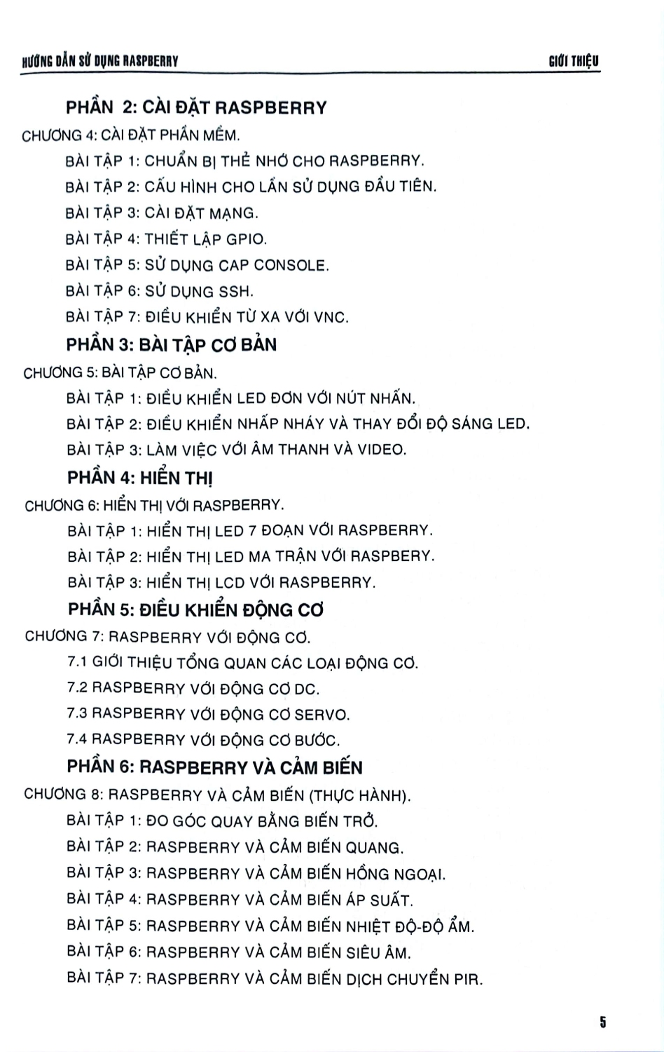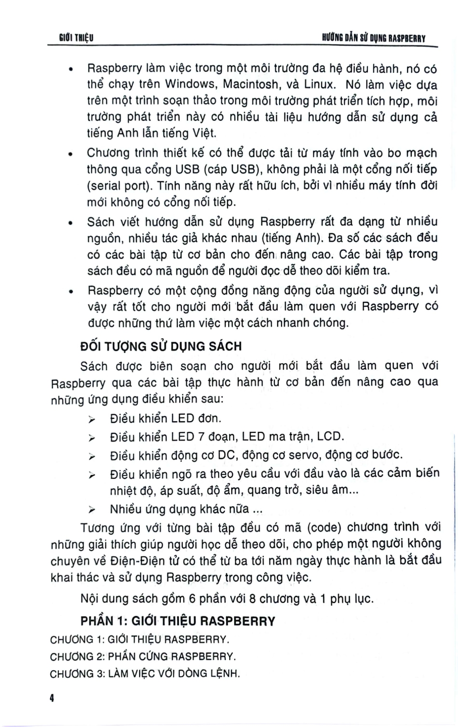 Sách được biên soạn cho người mới bắt đầu làm quen với Raspberry qua các bài tập thực hành từ cơ bản đến nâng cao qua những ứng dụng điều khiển sau: