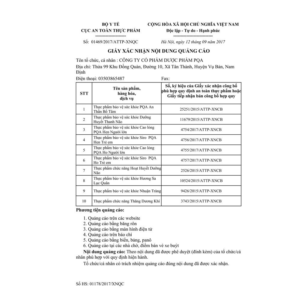- Địa chỉ sản xuất: Công ty Cổ phần Dược phẩm PQA. Thửa 99, Khu Đồng Quàn, Xã Tân Thành, Huyện Vụ Bản, Tỉnh Nam Định. THÀNH PHẦN: