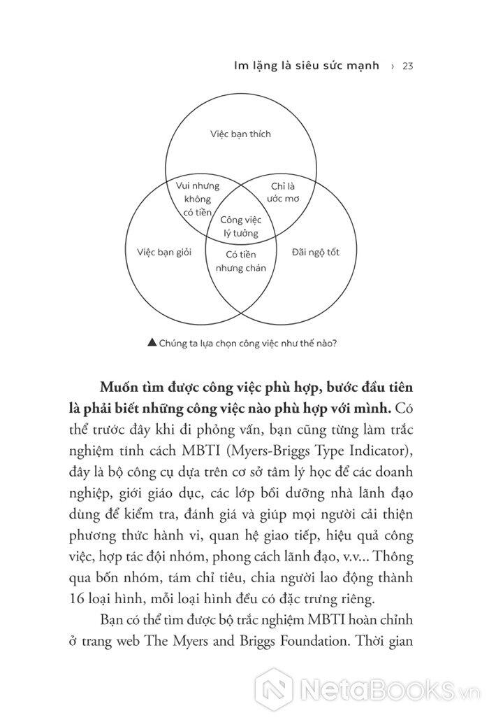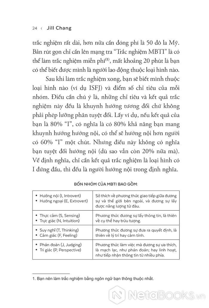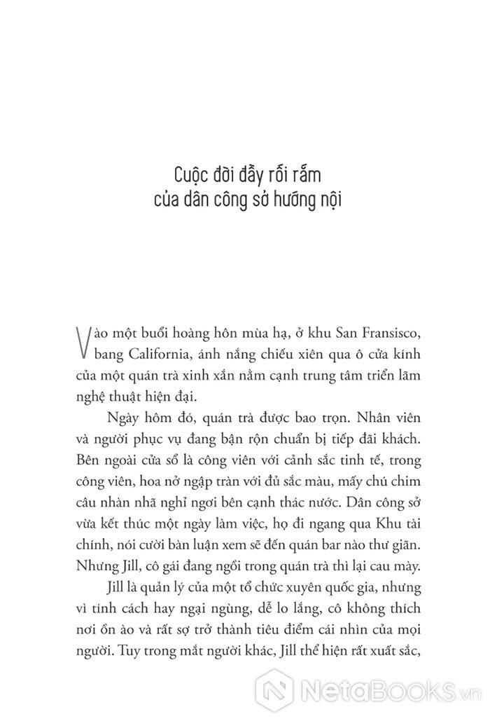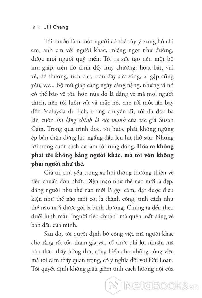 Phải chăng người hướng nội trầm lặng, kiệm lời và e thẹn, thì khó lòng làm chuyên gia marketing, không thể đảm nhiệm việc quyên tiền từ thiện quốc tế, cũng thiếu sức thuyết phục khi trở thành nhà tư vấn nghề nghiệp? Tác giả Jill Chang đã dùng thân phận “người hướng nội” để kể lại quá trình phấn đấu của mình trong các doanh nghiệp có nền văn hóa hướng ngoại, qua đó làm thay đổi những ấn tượng đóng khung thông thường về người hướng nội.