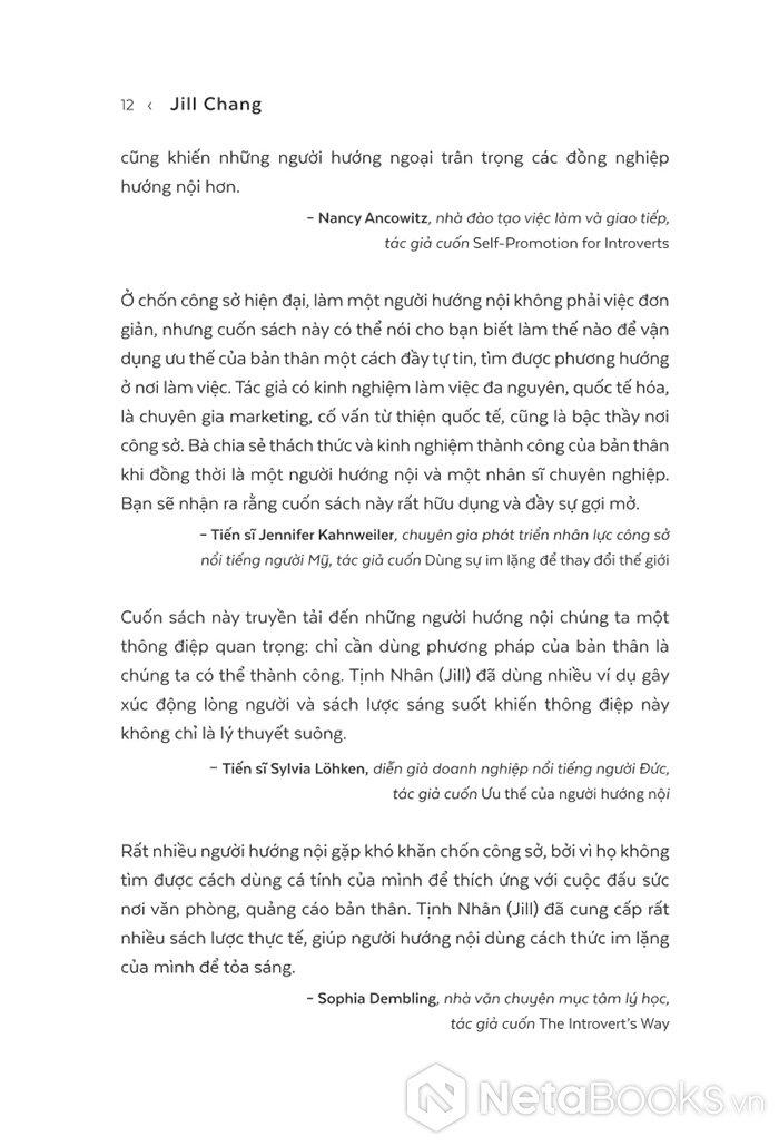Người hướng nội có thể thành công trong các nền văn hóa, ở các nơi làm việc khác nhau, Tịnh Nhân (Jill) chính là một ví dụ tuyệt vời. Cuốn sách hữu ích này của bà sẽ dẫn dắt độc giả vào cuộc cách mạng im lặng của người hướng nội. Từ nhiều ví dụ thực tế, Tịnh Nhân (Jill) cho thấy người hướng nội làm cách nào là chính mình, phát huy sở trường để có thể tỏa sáng nơi làm việc, trở thành tài sản tuyệt vời của công ty. Đây là cuốn sách hay mà các chiến sĩ im lặng chốn công sở hiện đại cần đọc. – Susan Cain, người sáng lập công ty Cách mạng Im lặng, tác giả cuốn Im lặng chính là sức mạnh