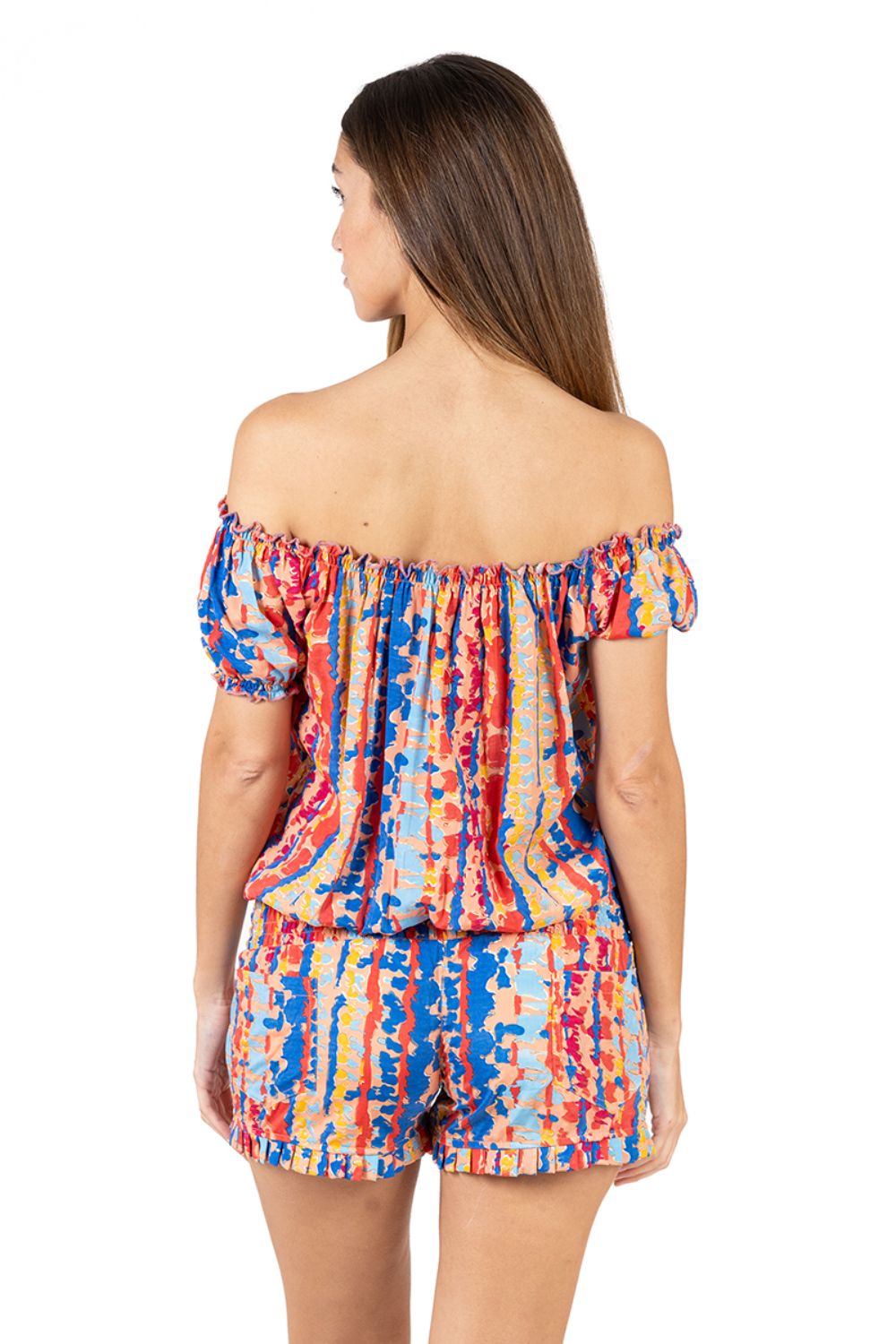 Jumpsuit Trễ Vai Isla Bonita, chất lụa mềm mại, nền vải vẽ ánh kim tinh tế. Vai thun co giãn, có thể mặc trễ vai hoặc kín vai. Có 2 túi phía sau. Lưng thun