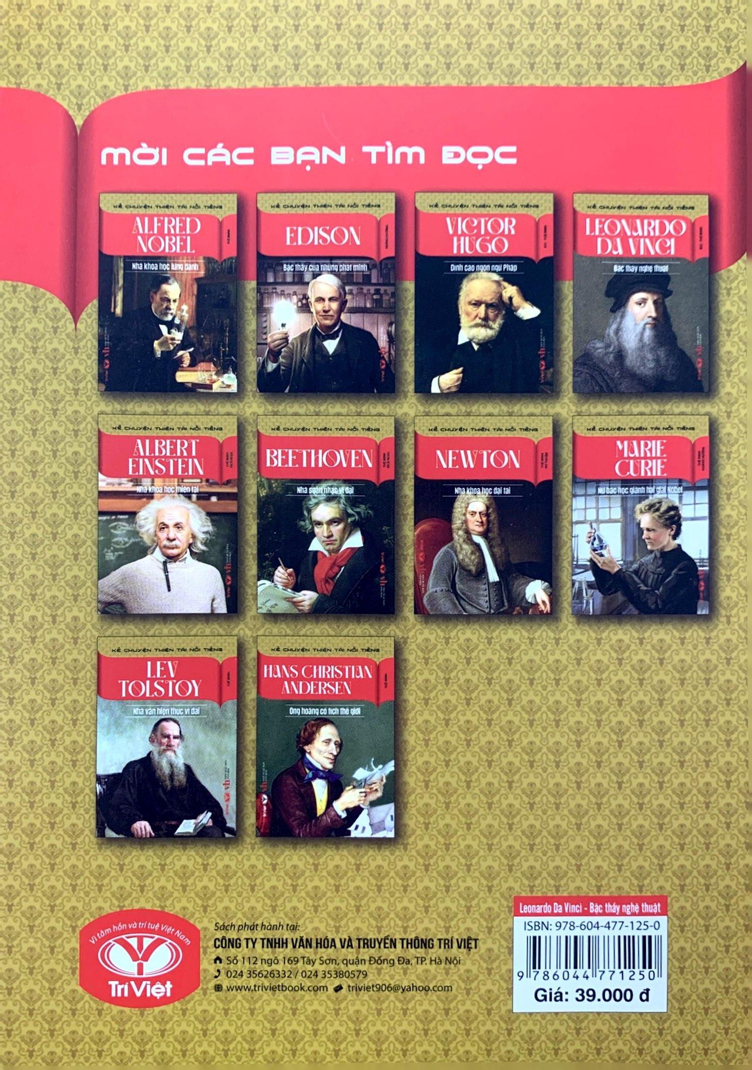 Bộ sách “KỂ CHUYỆN THIÊN TÀI NỔI TIẾNG” giới thiệu các danh nhân như: Alfred Nobel, Edison, Victor Hugo, Leonardo Da Vinci, Albert Einstein, Beethoven, Newton, Hans Christian Andersen, Marie Curie, Lev Tolstoy…
