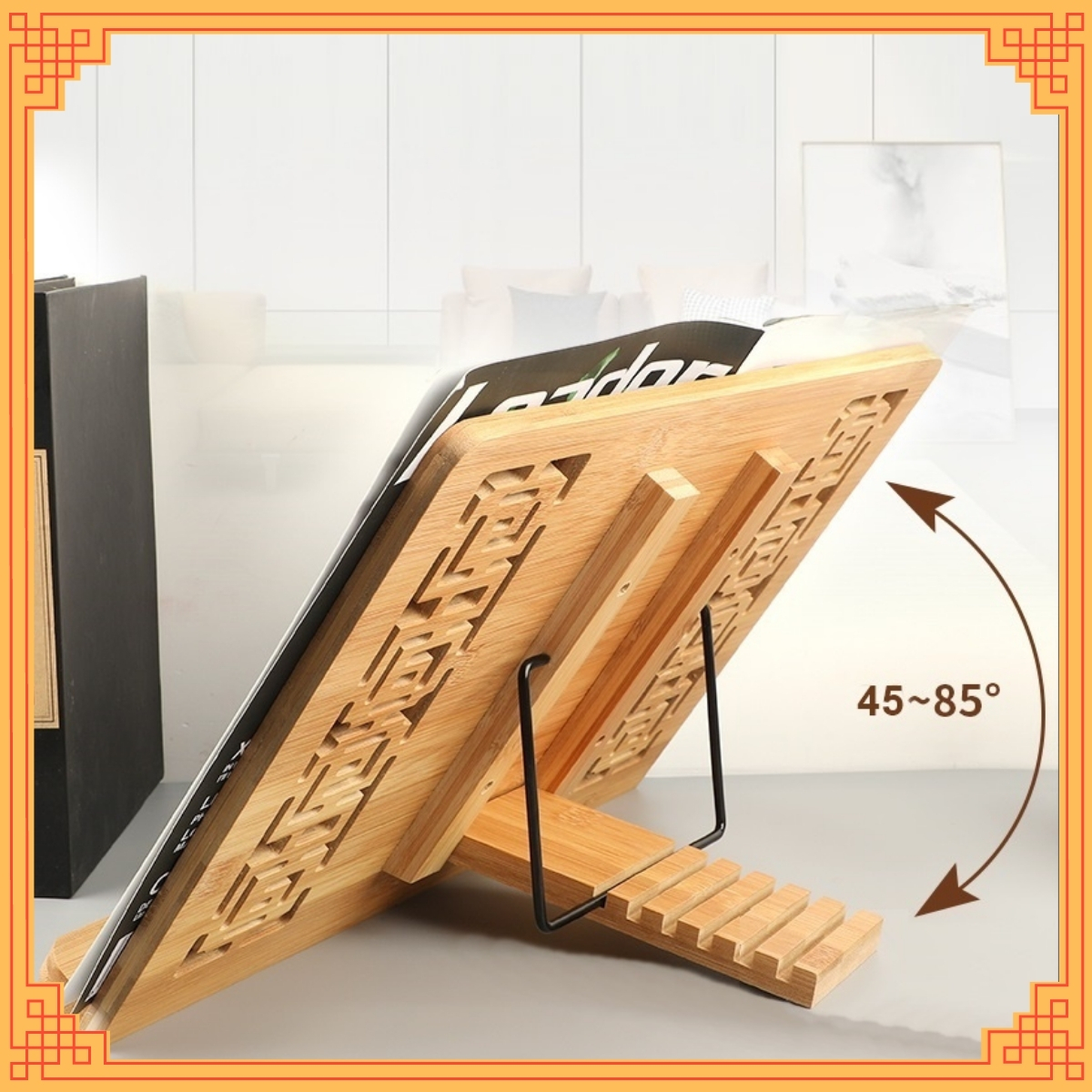 - Chân đế bằng gỗ tre ép, có 7 rãnh giúp điều chỉnh độ nghiêng của sách phù hợp với các tư thế đọc khác nhau.