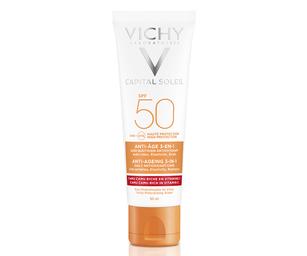Ánh nắng mặt trời là tác nhân gây hại hàng đầu cho làn da, có thể gây ra các tình trạng lão hóa da như xỉn màu, vết thâm nám, da khô và không đều màu, hình thành các vết nhăn. Các tia cực tím có thể xuyên qua mũ nón, khẩu trang, áo chống nắng và thận chí là làm tổn thương da khi chúng ta không tiếp xúc trực tiếp với ánh nắng mặt trời. Đây chính là lý do vì sao các chuyên da khuyên phải sử dụng kem chống nắng thường xuyên. Kem Chống Nắng Chống Lão Hóa Vichy Capital Soleil Anti-Ageing 3-in-1 có chỉ số SPF50 giúp chống lại các tia cực tím có hại cho da. Với kết cấu bám dính, thẩm thấu nhanh chóng, an toàn cho mọi loại da, ngay cả làn da nhạy cảm.   Công dụng: Chống tia UVA + UVB  toàn diện ngăn sạm da, lão hóa sớm và ung thư da Giúp che chắn và bảo vệ da khỏi tia tử ngoại có hại Cải thiện nếp nhăn Không gây bết dính hay nhờn rít Không để lại vệt trắng trên da Dành cho da nhạy cảm Thành phần chính: Vitamin C: sản xuất collagen, hết sức cần thiết cho sự lành vết thương, sự mạnh khỏe của nướu răng, và ngăn ngừa các mảng bầm ở da, Vitamin C cũng là một chất dinh dưỡng chống oxy hóa rất quan trọng Chiết xuất trà đen: giúp dưỡng ẩm, làm chậm tiến trình oxy hóa, đồng thời giúp làm mờ và giảm sự hình thành nếp nhăn và dấu chân chim trên da Không chứa paraben, silicon, không gây kích ứng, nhân mụn trứng cá Hướng dẫn sử dụng: Làm sạch tay và rửa mặt với nước tẩy trang và sữa rửa mặt Thoa kem chống nắng ở công đoạn cuối cùng Lấy một lượng sản phẩm vửa đủ ra lòng bàn tay Dùng tay đã thoa kem chống nắng vỗ nhẹ lên bề mặt da Nên thoa kem 15-20 phút trước khi chuẩn bị ra ngoài để kem có thể ngấm sâu vào da và phát huy tác dụng Thoa lại sau mỗi 2h khi chơi thể thao, bơi lội, hoạt động mạnh gây tiết nhiều mồ hôi Tẩy trang và rửa mặt thật sạch vào cuối ngày Thông tin sản phẩm: Thương hiệu: Vichy Loại sản phẩm: Kem Chống Nắng Chống Lão Hóa Dung tích: 50ml Xuất xứ: Pháp
