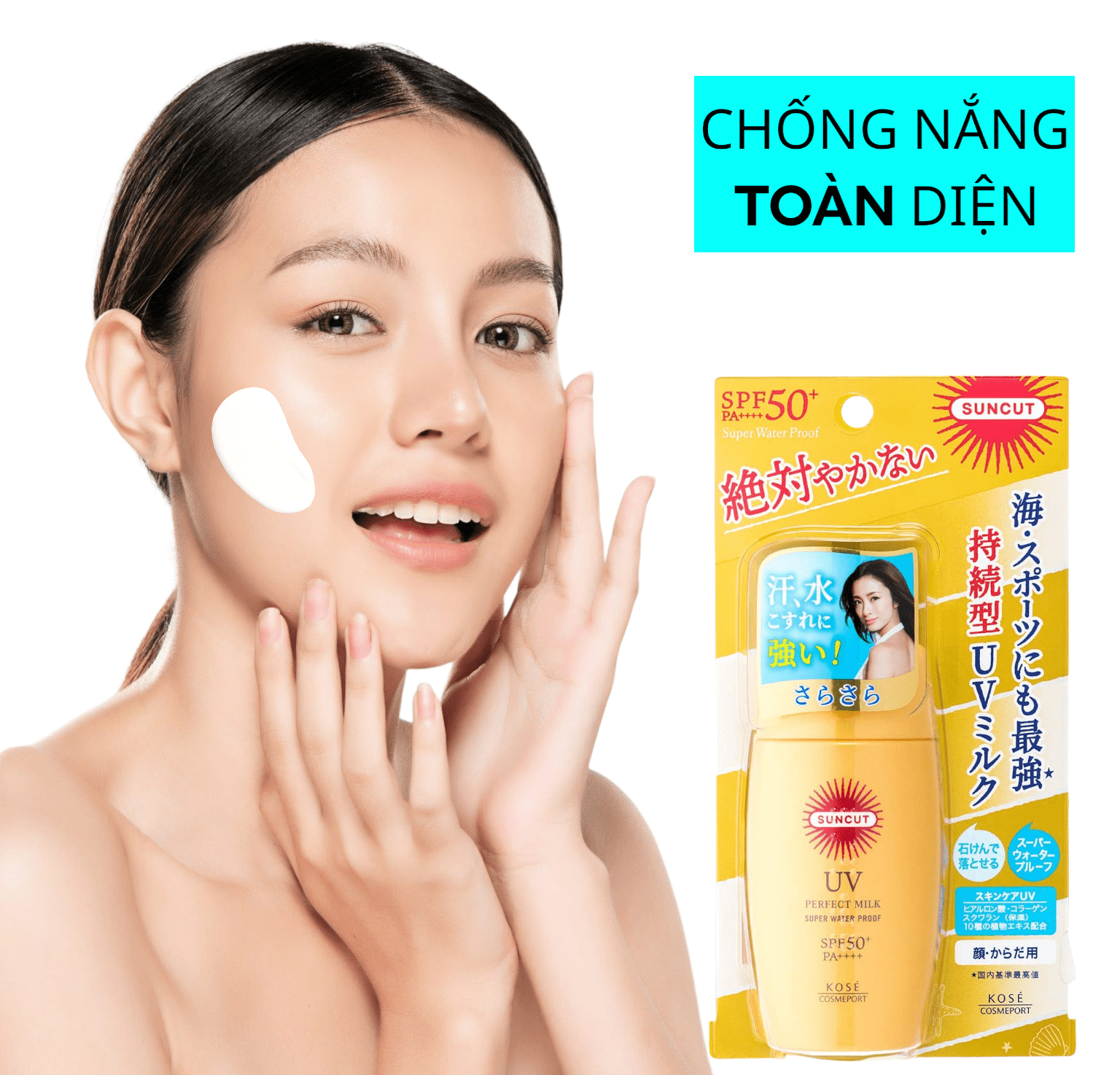 Kem Chống Nắng Kosé Suncut UV Essence Super Water Proof 60g Xuất xứ : Nhật Bản Khối lượng: 60g Chống nắng có kết cấu mỏng nhẹ, dễ dàng bám dính và thẩm thấu tốt vào da, cung cấp độ ẩm để ngăn ngừa sự khô ráp. Ngăn ngừa tác hại của tia UV với chỉ số chống nắng SPF50+/PA++++, kết hợp cùng công nghệ cảm biến chống thấm nước hiện đại giúp tăng cường lớp bảo vệ da khỏi tác hại của tia UV (UVA, UVB) suốt cả ngày, siêu chống thấm nước, kháng mồ hôi và bã nhờn. Ngăn ngừa các vết nám, nếp nhăn và tàn nhang do tiếp túc với ánh nắng mặt trời. Bảo vệ da khỏi sự tác động của môi trường như: bụi bẩn, ô nhiễm không khí, phấn hoa, …Có thể dùng thay thế lớp lót trang điểm và giúp tăng cường độ keo và độ bám của lớp nền và ngăn lớp trang điểm bị trôi. Chỉ cần làm sạch với xà phòng thông thường. Cách dùng: Dùng buổi sáng hoặc trước khi ra nắng và thoa lớp nền. Lắc đều chai, nhẹ nhàng thoa khắp mặt và toàn thân. Nên thoa lại sau khi bạn dùng khăn lau, đìều này đảm bảo tối ưu việc bảo vệ da khỏi tác hại từ tia UV. Bảo Quản: Tránh để nơi quá lạnh và ánh nắng trực tiếp vào sản phẩm, để xa tầm tay trẻ em khi không sử dụng. Lưu Ý: Khi dùng nếu có biểu hiện như mẩn ngứa hay có triệu chứng gì bất thường thì ngừng không được sử dụng