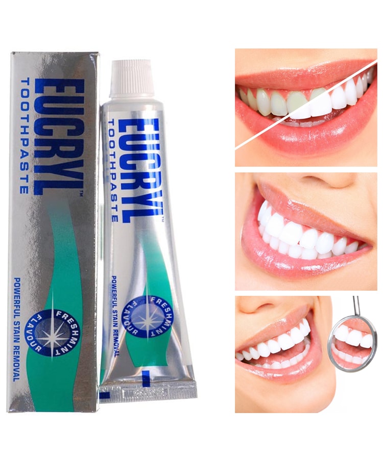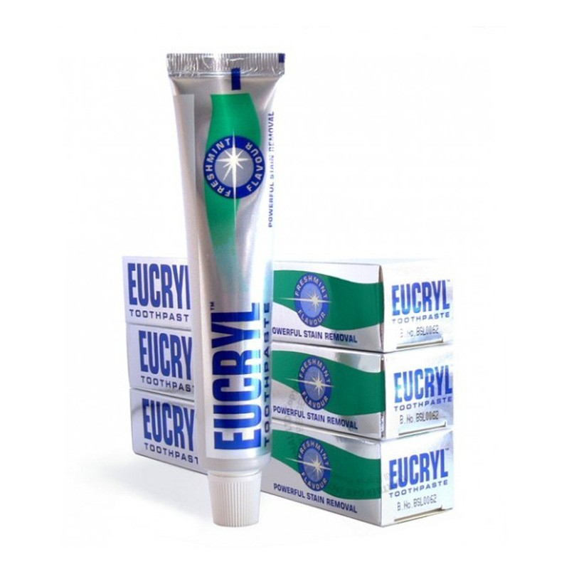 - Kem đánh răng trắng răng Eucryl Tooth Paste giúp làm trắng răng hiệu quả. Ngoài ra sản phẩm Eucryl còn có công dụng giúp hơi thở thơm mát và tránh việc hình thành các mảng bám trên răng.