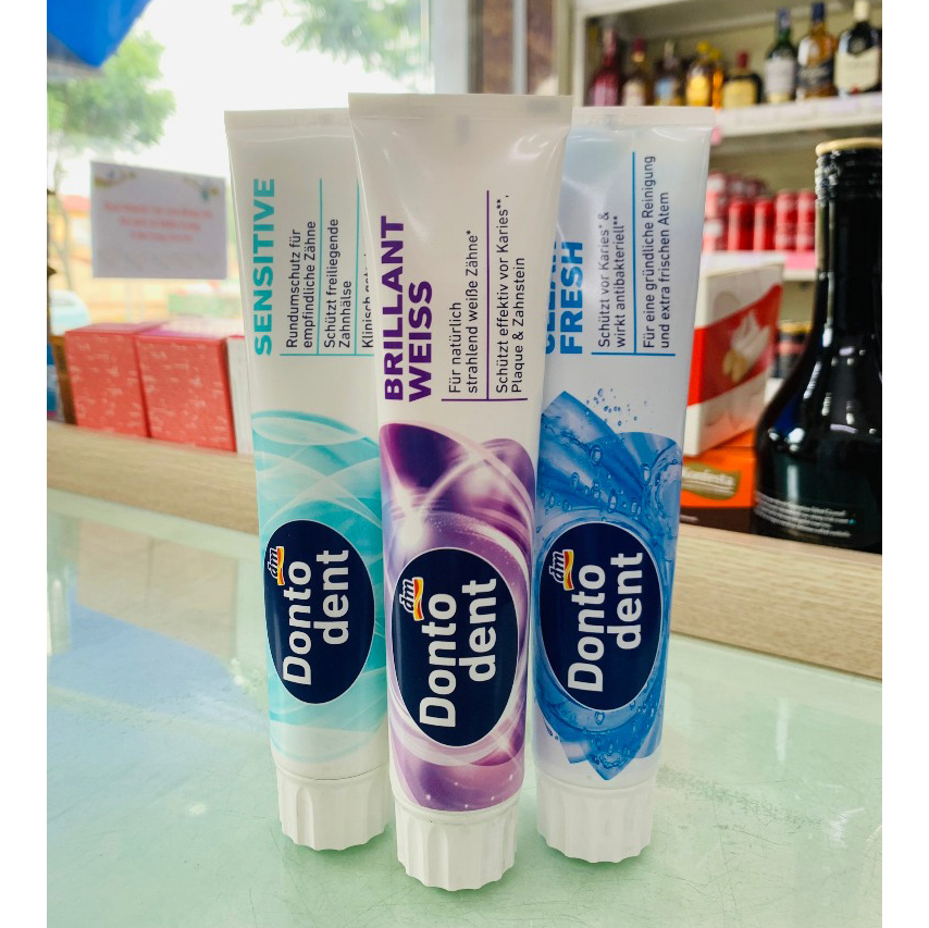 Kem đánh răng Dontodent Clear Fresh nhập khẩu Đức tuýp 125 ml giúp răng miệng sạch sẽ và tươi mát. Dễ dàng loại bỏ triệt để mảng bám răng. Hương vị bạc hà tươi mới, dễ chịu và flour hỗ trợ phục hồi men răng. Sản phẩm chỉ thích hợp cho người lớn.