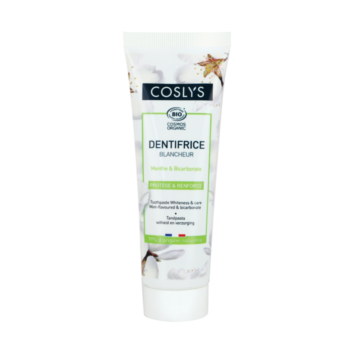 Chứng nhận hữu cơ Ecocert Chứng nhận Hữu cơ bởi Cosmos Organic ️Thương hiệu: Coslys - Pháp Kem đánh răng hữu cơ làm trắng răng hương hoa Coslys với mùi hương hoa cỏ ngọt, thành phần được làm giàu với bicarbonate và lô hội sẽ nhẹ nhàng đánh bóng răng, đồng thời củng cố men răng.