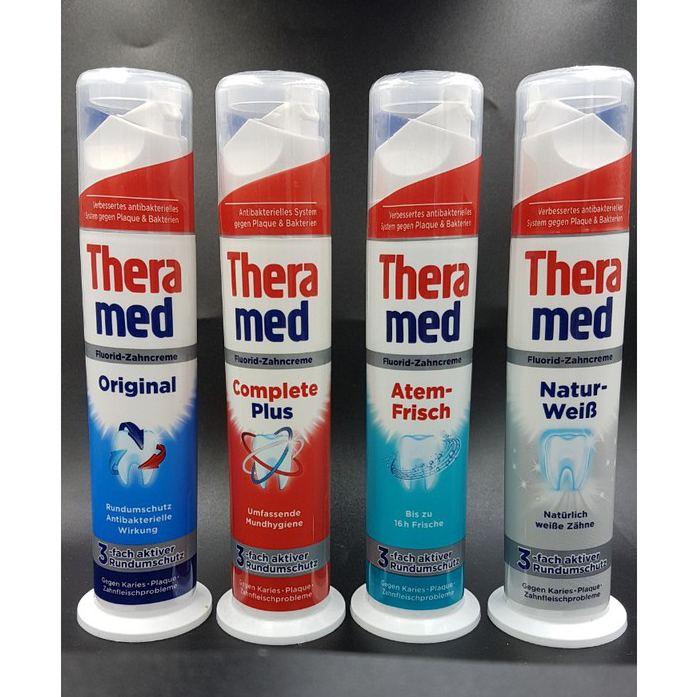 MÔ TẢ SẢN PHẨM Hạn sử dụng: 12 tháng sau khi mở nắp. Xuất xứ: Thương hiệu Theramed, Đức. Đóng gói: Ống nhựa chứa 100ml dạng kem. Độ tuổi sử dụng: Người lớn. Kem đánh răng Theramed giúp ngừa khuẩn, loại bỏ mảng bám, làm cứng men răng và bảo vệ răng nướu gấp 3 lần. Sản phẩm được ưa chuộng tại Đức với tác dụng bảo vệ tích cực lâu dài sau khi sử dụng. CÔNG DỤNG VÀ THÀNH PHẦN Làm sạch răng với Calcium, chống mảng bám và ngừa sâu răng hiệu quả. Bảo vệ nướu răng, ngăn ngừa việc hình thành cao răng. Công thức fluoride giúp ngăn ngừa sâu răng, tăng cường khả năng bảo vệ răng chắc khỏe. Mang lại cảm giác tươi mát và sạch sẽ cho khoang miệng. Thiết kế ống bắt mắt, tiện lợi khi sử dụng. Phân loại sản phẩm Đỏ (Complete Plus): Vệ sinh toàn diện răng miệng. Xanh Dương (Original): Diệt khuẩn, bảo vệ răng và nướu. Xanh Atern Frish: Hiệu quả 16 giờ, kết hợp giữa kem đánh răng và nước súc miệng. Màu trắng (Natur Weib): Làm trắng chuyên sâu, giúp răng trắng sáng. HƯỚNG DẪN SỬ DỤNG Đánh răng ít nhất 2 lần mỗi ngày trong 3 phút để bảo vệ răng miệng toàn diện. Mở nắp ống và ấn nhẹ vào nút bấm để lấy kem. Nếu kem không ra, nhấn vào đáy ống cho đến khi kem chảy ra. LƯU Ý Bảo quản ở nhiệt độ thường, tránh ánh nắng trực tiếp.