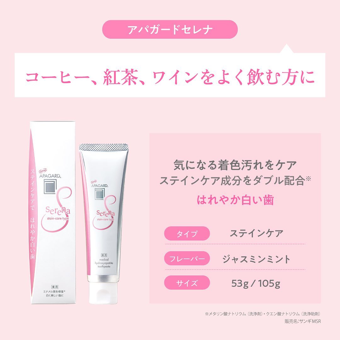 Kem Đánh Trắng Sáng Răng Apagard Serena 53g Xuất xứ : Nhật Bản Khối Lượng Tịnh: 53 g Mã Vạch: 4987643121117 Công Dụng Kem Đánh Trắng Sáng Răng Apagard Serena 53g: Kem đánh răng giúp loại bỏ vết bẩn, mảng bám trên răng. Ngoài ra, giúp răng chắc khỏe, trắng, bóng sáng. Kem đánh răng giúp thơm miệng sau khi đánh răng. Việc sử dụng kem đánh răng Apagard sẽ làm sáng bóng răng, làm sạch miệng, ngăn ngừa hôi miệng. Hướng dẫn sử dụng: Lấy một lượng vừa phải lên bàn chải, chải đều lên răng sau đó làm sạch bằng nước. Bảo Quản: Tránh để nới quá lạnh và ánh nắng trực tiếp vào sản phẩm, để xa tầm tay trẻ em khi không sử dụng. Lưu Ý: Trong trường hợp thấy bất kỳ hiện tượng phát ban hoặc kích ứng nào sau khi sử dụng sản phẩm này, hãy ngừng sử dụng và tham khảo ý kiến bác sĩ, nha sĩ hoặc dược sĩ. Sản phẩm này là một loại kem đánh răng, vì vậy vui lòng không nuốt. Thành Phần Kem Đánh Trắng Sáng Răng Apagard Serena 53g:: Dicalcium Phosphate, Aqua, Glycerin, Silica, Hydroxyapatite, Peg-8, Sodium Lauryl Sulfate, Cellulose Gum, Aroma, Sodium Metaphosphate, Sodium Citrate, Trimagnesium Phosphate, Hydrolyzed Conchiolin Protein, Sodium Saccharin, Glycyrrhetinic Acid, Cetylpyridinium Chloride, Lauryl Diethylenediaminoglycine Hcl.