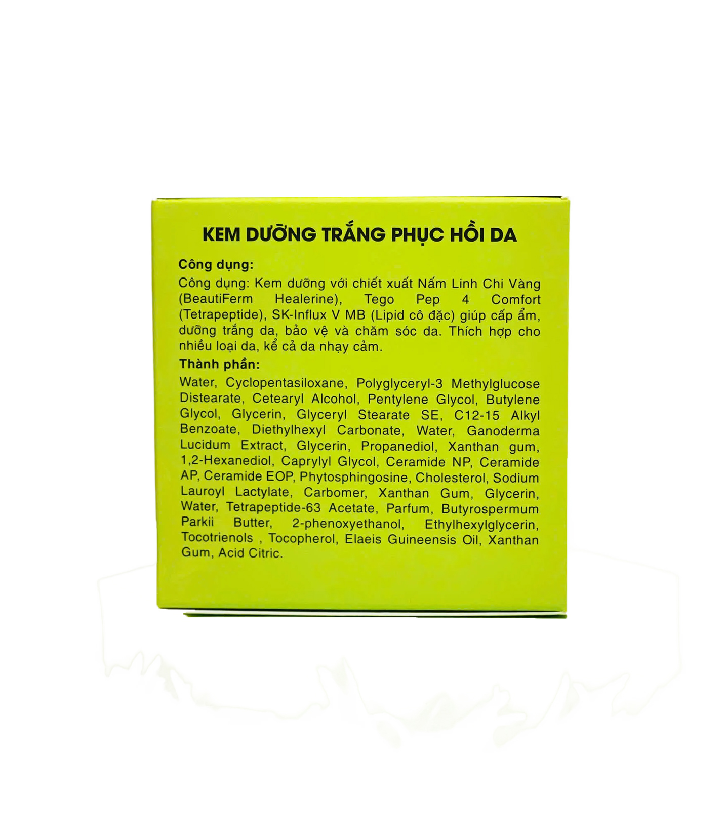 Công dụng: Kem dưỡng với chiết xuất Nấm Linh Chi Vàng, giúp cấp ẩm, dưỡng trắng da, bảo vệ và chăm sóc da… Thích hợp cho nhiều loại da, kể cả da nhạy cảm. Thành phần: