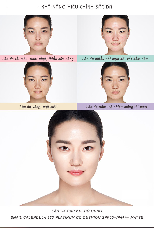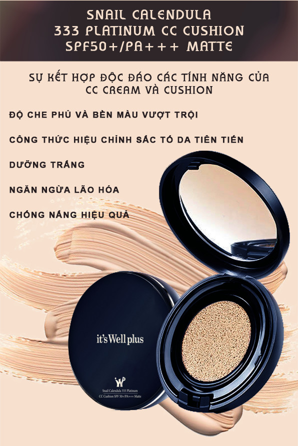- Lõi Phấn Nước Trang Điểm Kiềm Dầu & Dưỡng Trắng Da it's Well plus Snail Calendula 333 Platinum CC Cushion SPF50+/PA+++ Matte (15g) là sự kết hợp các tính năng nổi trội của CC