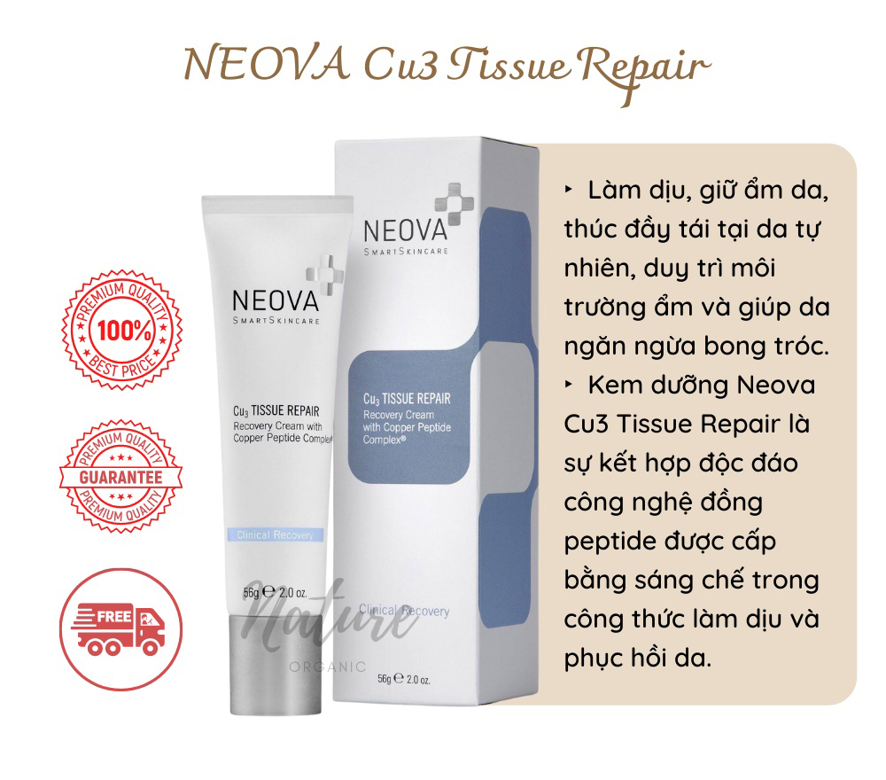 là dòng kem siêu phục hồi da tổn thương sau laser, lăn kim… Sản phẩm có khả năng thúc đẩy quá trình tái tạo da tự nhiên sau điều t rị thẩm mỹ. Giúp hết ngứa, làm dịu da và làm lành vết thương nhanh. Đồng thời duy trì độ ẩm tối đa cho da và hồi sinh da khỏe mạnh, tươi mới. Kem phục hồi da tổn thương sau laser, lăn kim Neova Cu3 Tissue Repair. Làn da mỏng yếu, bị tổn thương sau điều t rị thẩm mỹ cần được chăm sóc bởi kem dưỡng phục hồi Neova Cu3 Tissue Repair Với thời đại công nghệ ngày càng phát triển mạnh mẽ, phái đẹp ưa chuộng hơn cách làm đẹp bằng công nghệ như laser, lăn kim… Nhưng sau khi áp dụng các phương pháp này, làn da sẽ đối mặt với những rủi ro nếu bạn không có cách chăm sóc và bảo vệ da tốt nhất. Bởi lúc này, da rất mỏng yếu, bị ngứa rát, sưng đỏ và dễ bị kích ứng. Làn da sau điều t rị lăn kim, laser…mỏng yếu, dễ kích ứng. Thấu hiểu nhu cầu của khách hàng, hãng  – Mỹ đã nghiên cứu và cho ra đời dòng Neova Cu3 Tissue Repair. Đây là dòng kem dưỡng siêu phục hồi da tổn thương sau laser, bỏng hay lăn kim đã nhận được sự đánh giá tích cực từ các chuyên gia cũng như những khách hàng đã sử dụng qua. Hiệu quả vượt trội nhất của kem phục hồi da tổn thương Neova Cu3 Tissue Repair là khả năng làm dịu da, căng da, ngứa rát. Hết nhanh tình trạng bong vảy, đóng vảy trên da. Tích cực phục hồi nhanh chóng những tổn thương trên da. Tăng cường các dưỡng chất, duy trì độ ẩm tối đa để tái tạo da tốt nhất và đưa làn da trở về trạng thái mềm mại, tươi tắn và khỏe mạnh như ban đầu. Neova Cu3 Tissue Repair là “giải pháp” tốt nhất để chăm sóc và phục hồi da sau tổn thương. Đây là những đối tượng đặc biệt thích hợp để sử kem phục hồi da tổn thương Neova Cu3 Tissue Repair
