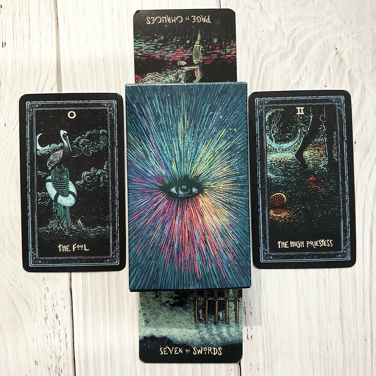 Bộ bài Starchild Tarot của họa sĩ Danielle Noel được xem là một sự bất ngờ ngoài mong đợi dành cho cộng đồng, với phong cách độc đáo và gợi ý nghĩa sâu sắc. Mô phỏng bầu trời, thiên hà và những vì sao dựa trên những quan điểm về chiêm tinh, hình học cổ xưa, Starchild Tarot như một “làn gió mát” giữa hàng loạt những tựa bài Tarot xuất sắc khác khi gợi lên cho người dùng cảm giác bay bổng, êm dịu và nhẹ nhàng. Bộ bài được đánh giá cao ở khía cạnh ứng dụng chữa lành tâm hồn, suy niệm và phản ánh bản thân. Những tông màu rực rỡ trên các lá bài được phủ lên một lớp màu retro trắng sáng cổ điển, biến Starchild Tarot trở thành lựa chọn tuyệt vời cho những ai muốn tìm kiếm một bộ bài Tarot với chủ đề tích cực, tươi sáng và giàu ý nghĩa. Ấn tượng ban đầu khi nhìn vào The Prisma Visions Tarot có thể không thật mạnh mẽ, nhưng khi chiêm nghiệm đủ thời gian những chi tiết trên từng lá bài, bạn sẽ dễ dàng “nhập tâm” vào thế giới đầy ảo giác và có phần kỳ quái đó. Bất cứ ai đã quen thuộc với hệ thống hình ảnh và biểu tượng truyền thống Rider Waite Smith đều có thể nhận ra sự tương ứng ở từng của The Prisma Visions Tarot, bất kể những khác biệt do chủ đề và bối cảnh bộ bài tạo ra. Khi không đóng khung suy nghĩ trong lý thuyết truyền thống và nhìn nhận sự quen thuộc đó với một tâm trí “mở” hơn, ta còn có thể thậm chí tìm ra được những tầng nghĩa khác biệt đầy sâu sắc và thú vị. Nói cách khác, người dùng sẽ không cảm thấy quá khó khăn khi tìm hiểu và sử dụng The Prisma Visions, và bộ bài này còn có thể dẫn dắt họ đến với những hiểu biết sâu hơn, những suy nghĩ thuần khiết nhất đúng như tên gọi của bộ bài. The Prisma Visions Tarot có phần cạnh được mạ bạc và in trên giấy cứng có độ dày và chất lượng rất cao. Bộ bài này có tất cả những gì bạn cần: sự thu hút một cách kỳ diệu về nghệ thuật, tình yêu, sự nghiêm túc, tính giải trí và quan trọng nhất là khả năng khai sáng tâm linh đáng kể Nhà sản xuất: James R. Eads Tác giả: James R. Eads Bao gồm: 79 Lá bài