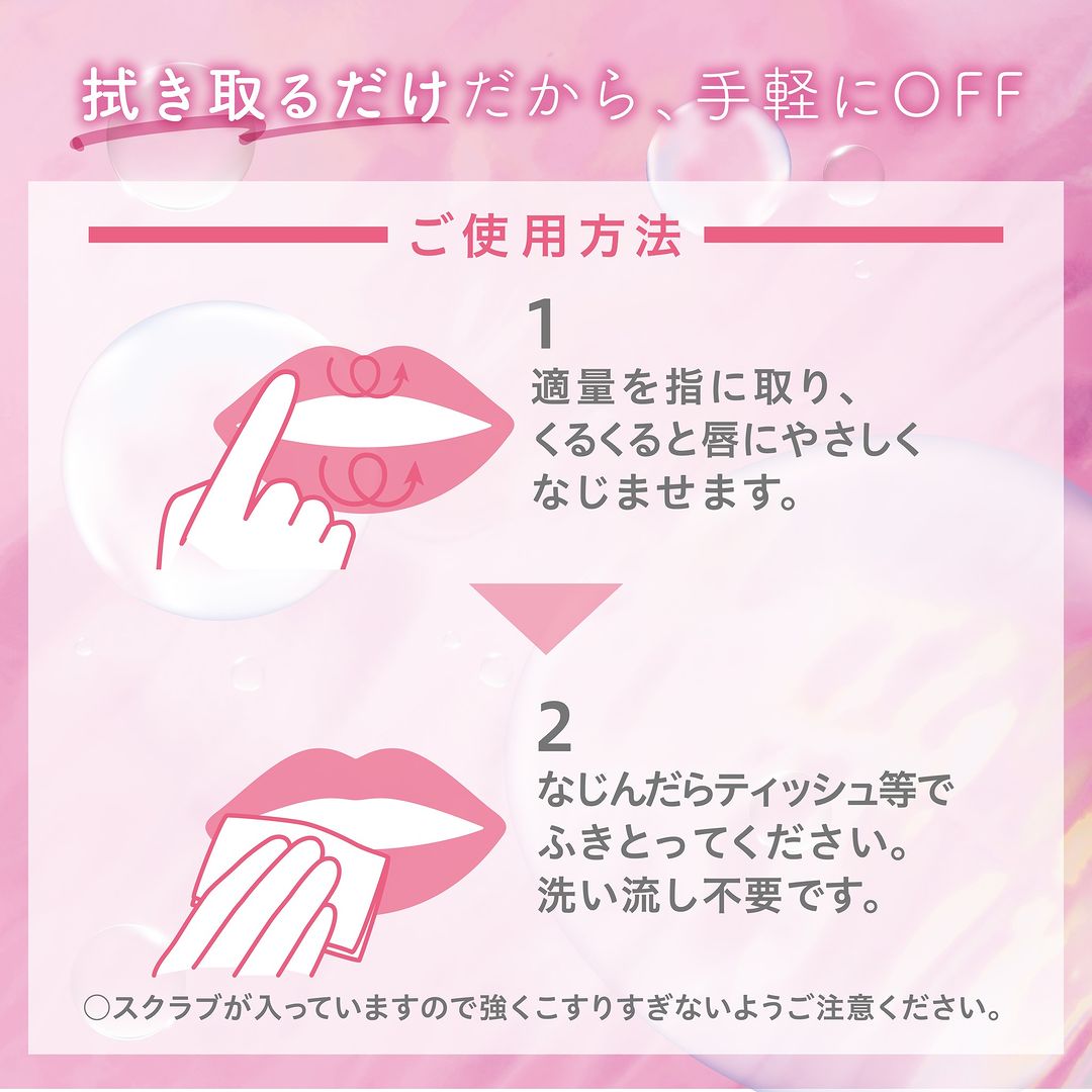 Hướng Dẫn Sử Dụng: Làm sạch môi, lấy một lượng vừa đủ thoa đều lên vùng da môi, nhẹ nhàng massage theo hình xoắn ốc từ 1 – 2 phút để lấy tế bào chết trên môi dễ hơn. Sau đó sử dụng khăn mềm lau sạch hoặc rửa lại với nước.