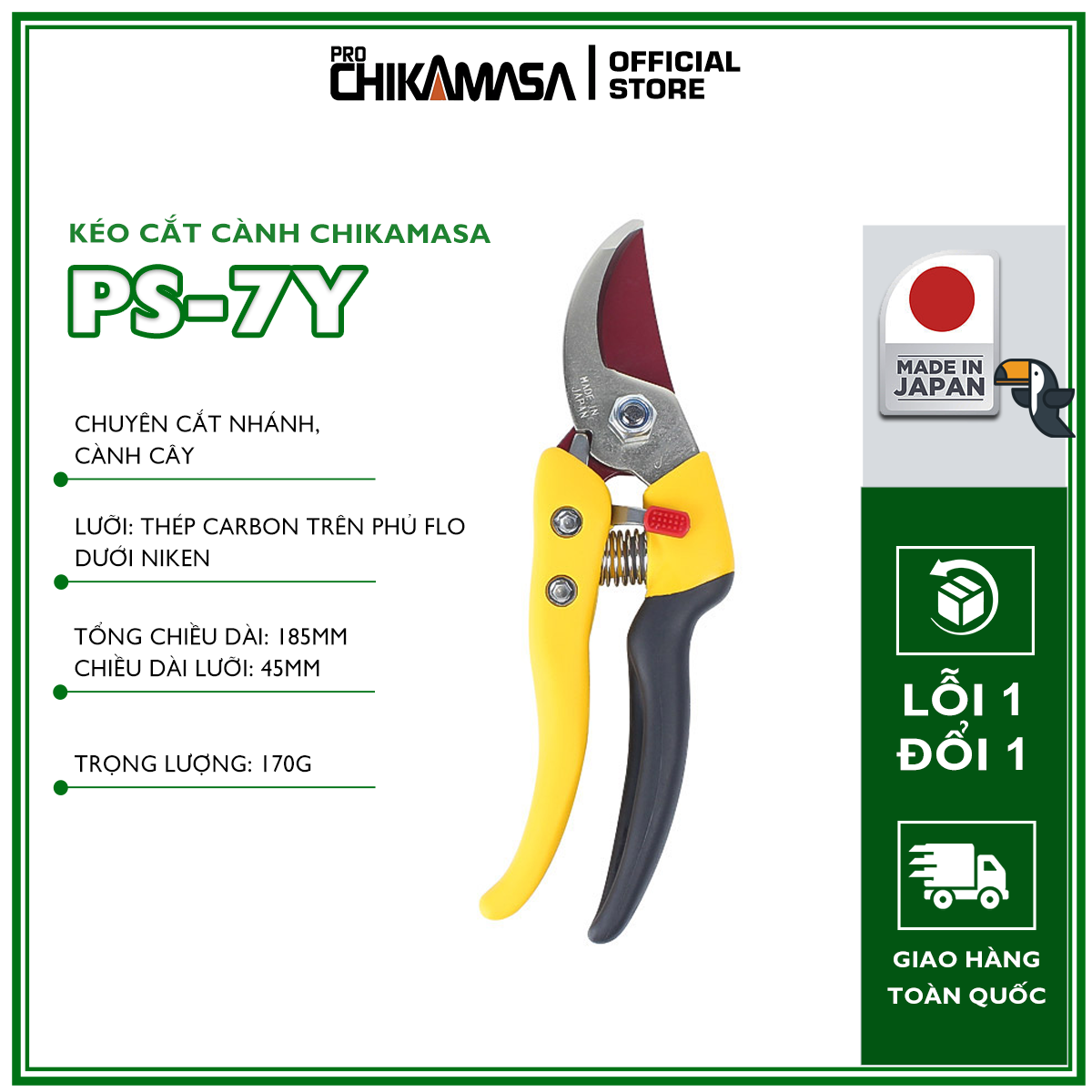 Kéo cắt cành Chikamasa PS-7G có diện mạo hầm hố so với nhiều phiên bản khác vì được đầu tư kỹ lưỡng. Chiếc kéo này dành cho những người thuận tay phải tập trung sức mạnh cắt cành nhánh dày, cuống quả như bưởi, gấc, v.v. Tổng chiều dài: 185mm. Chiều dài lưỡi: 45mm Trọng lượng: 170g Lưỡi: thép carbon chất lượng cao. : lưỡi gà / mạ niken không điện. Chất liệu tay cầm: PA+GF, chát đàn hồi. Xuất xứ: Japan