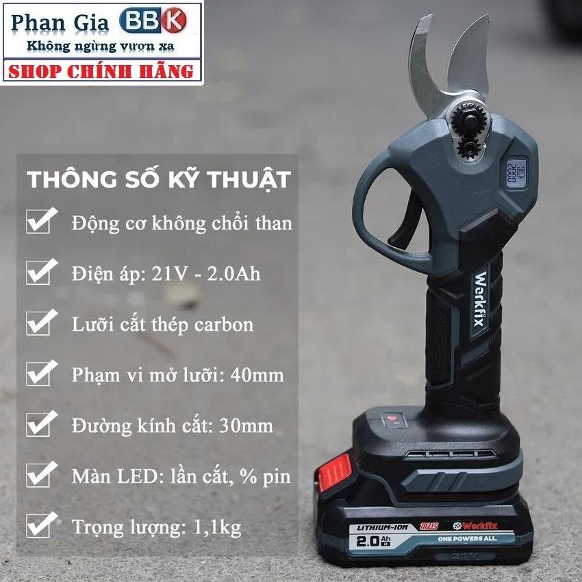 THÔNG TIN SẢN PHẨM - Tên sản phẩm: Kéo cắt cành pin WORKFIX WF-CP30BL, Động cơ Không chổi than, Màn hình led hiển thị, Cắt 3cm - Thương hiệu: WORKFIX - Xuất xứ: Trung Quốc