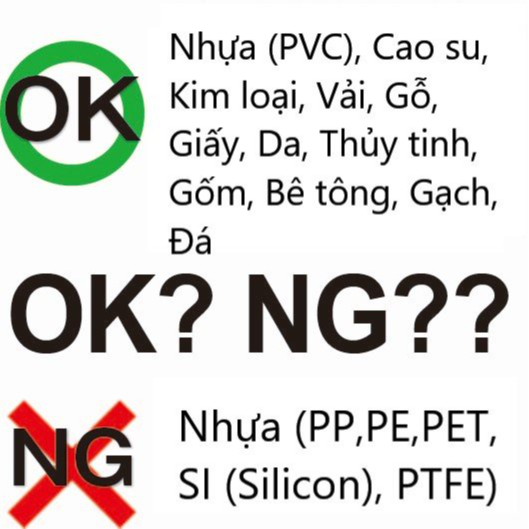 - LƯU Ý: Sản phẩm KHÔNG DÁN ĐƯỢC trên vật liệu nhựa (PP- Polyprotylen, PE-polyetylen, PET, Silicon), nhựa flo, sản phẩm giá trị cao