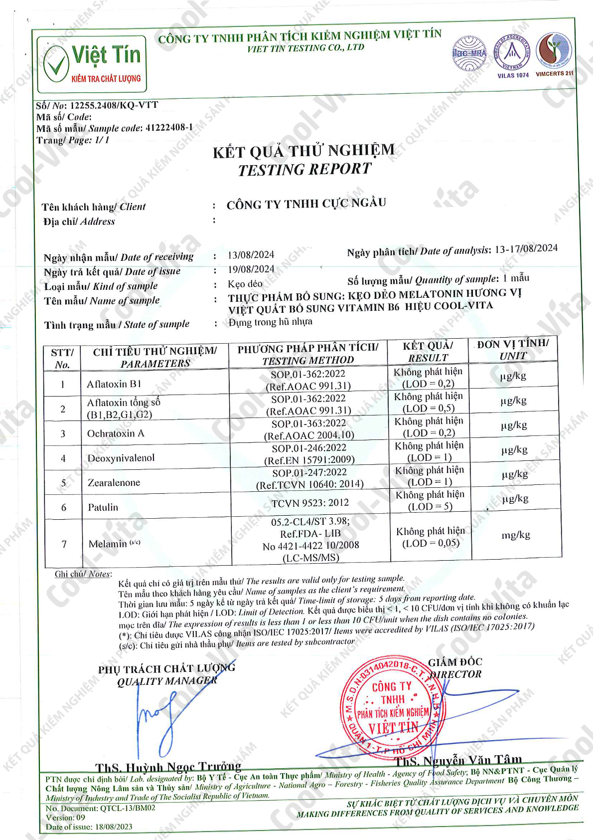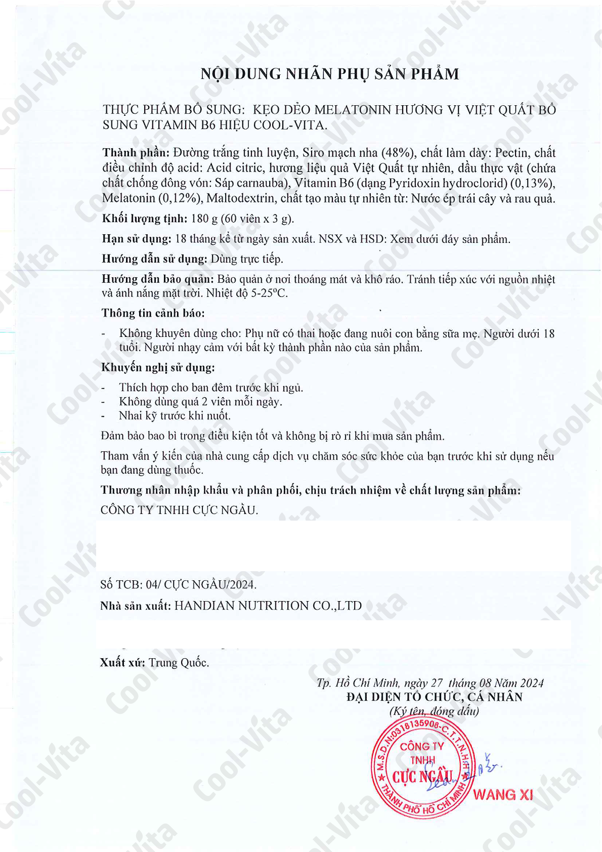Kẹo Dẻo Melatonin Hỗ Trợ Giấc Ngủ Ngon Sleep Well Gummies & Hỗ Trợ Giảm Căng Thẳng Vị Việt Quất Kết Hợp Vitamin B6 Coolvita – (60 viên x 3g)/hộp vitamind Bạn đang gặp khó khăn khi đi vào giấc ngủ? Vậy thì đừng nên bỏ qua Kẹo Dẻo Melatonin Vị Việt Quất của CoolVita! Kẹo Dẻo Melatonin CoolVita Vị Việt Quất Kết Hợp Vitamin B6 hỗ trợ điều chỉnh chu kỳ giấc ngủ và hỗ trợ cải thiện chất lượng giấc ngủ ngon hơn. Với 6mg melatonin trong mỗi 2 viên kẹo, kết hợp cùng vitamin B6 hỗ trợ giảm căng thẳng, có một đêm ngủ ngon và sâu hơn. Lợi ích nổi bật: Hỗ trợ cải thiện chất lượng giấc ngủ: Mỗi 2 viên kẹo dẻo chứa 6mg Melatonin kết hợp Vitamin B6 hỗ trợ điều chỉnh chu kỳ giấc ngủ tự nhiên, giúp bạn dễ dàng đi vào giấc ngủ và duy trì giấc ngủ sâu suốt đêm. Hỗ trợ giúp thư giãn trước khi ngủ: Vitamin B6 giúp tạo cảm giác thư giãn trước khi ngủ, giúp cơ thể dễ dàng đi vào giấc ngủ. An toàn và lành mạnh: Kẹo Dẻo Melatonin CoolVita không phải là thuốc ngủ, hỗ trợ bạn ngủ ngon hơn. Nguyên liệu từ thực vật: Được làm bằng pectin từ thực vật thay vì gelatin, sản phẩm an toàn cho sức khỏe và phù hợp với chế độ ăn chay.   Đặc điểm sản phẩm: Hương vị thơm ngon: Vị việt quất chua ngọt dễ chịu, kẹo dẻo mềm mịn, ngon miệng, không gây dính răng. Dễ sử dụng: Sản phẩm được chế biến thành dạng kẹo dẻo nhai tiện lợi. Tiện lợi mang theo: Hộp nhựa nhỏ gọn, dễ dàng mang theo khi đi công tác hoặc du lịch.   Thành phần: Đường trắng tinh luyện, Siro mạch nha (48%), chất làm dày (Pectin), chất điều chỉnh độ acid: Acid citric, hương liệu quả việt quất tự nhiên, dầu thực vật (chứa chất chống đông vón: Sáp carnauba), Vitamin B6 (dạng Pyridoxin hydrochloric 0,13%), Melatonin (0,12%), Maltodextrin, chất tạo màu tự nhiên. Nước ép trái cây và rau quả.   Khối lượng tịnh: 180g (60 viên x 3g)   Hướng dẫn sử dụng: