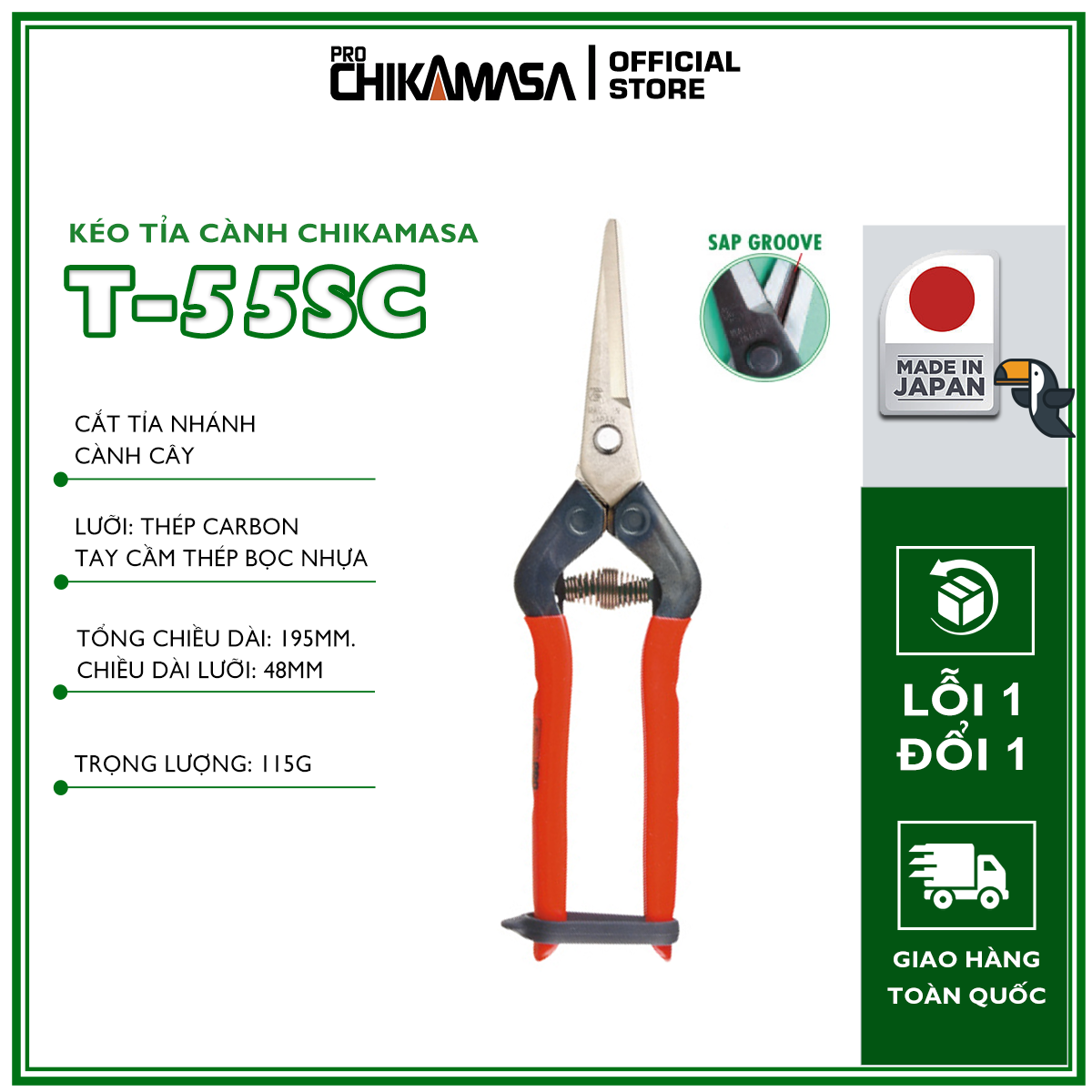 - Kéo tỉa cành Chikamasa T-55SC siêu tiết kiệm Chẳng hề cầu kỳ trong thiết kế hay màu sắc, Chikamasa T-55SC hướng đến trải nghiệm cắt tỉa cành lá nhanh, gọn và an toàn. Dòng kéo này phù hợp nhất với công việc săn sóc, tỉa tót cây cảnh nhỏ ở gia đình, sân vườn. Nếu bạn cần chiếc kéo bén ngọt, không làm dập cành, chảy nhựa thì đây là phiên bản nên có mặt trong bộ dụng cụ làm vườn của mình. Kéo tỉa cành Chikamasa T-55SC kiểu dáng tí hon nhưng bền khỏe và sắc bén, xử đẹp nhánh lá nhỏ một cách nhẹ nhàng. Một trợ thủ nhanh nhẹn để dọn sạch chi tiết thừa trên cây cảnh, hoa kiểng hết sức linh hoạt và thân thiện. Với chỉ vài trăm ngàn đồng, bạn có ngay mẫu kéo đạt tiêu chuẩn Nhật Bản, an tâm xài thoải mái qua năm tháng. THÔNG SỐ KỸ THUẬT