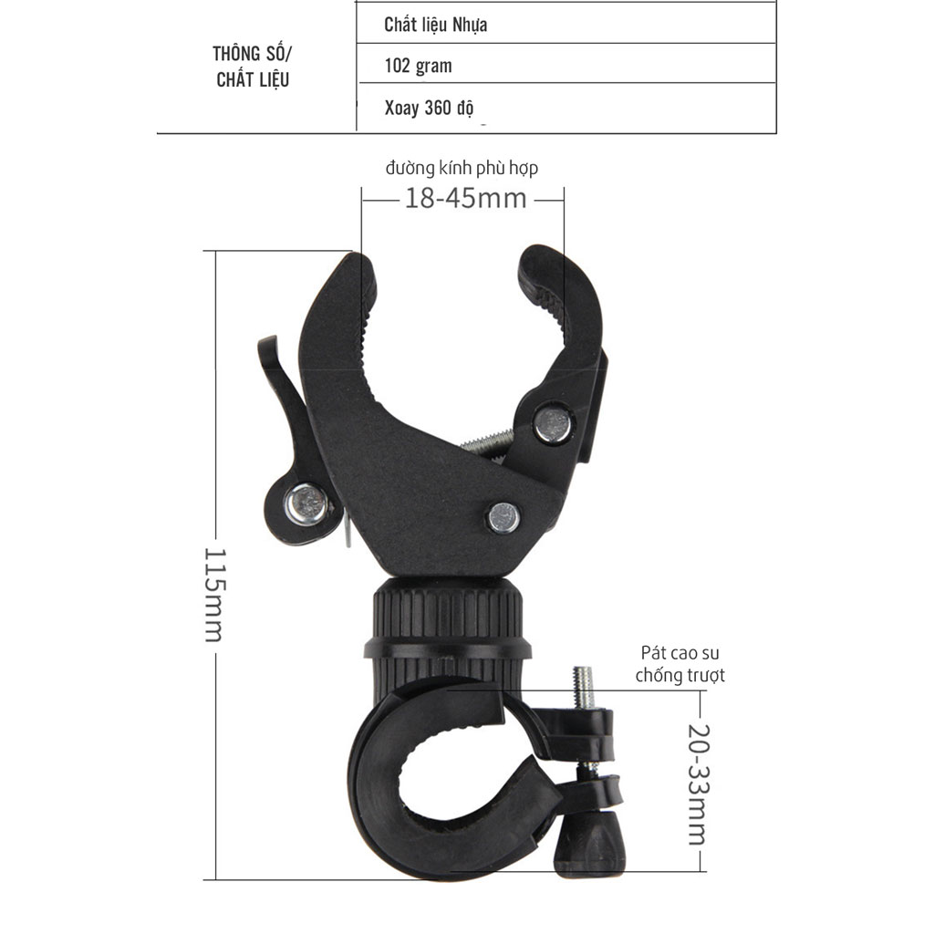 Mua tại TiktokKẹp Gắn Đèn Pin Xe Đạp Gắn Ghi Đông Tay Lái Xoay 360 Độ Chắc Chắn Mai Lee (không kèm đèn pin) Chất liệu: nhựa kỹ thuật PC Đường kính trên (cho đường kính của đèn pin): 1.8-4.5 cm Đường kính bên dưới (cho đường kính của tay lái): 2.0-3.3 cm Độ dài: 10.5 cm Trọng lượng: 102 gam Thiết kế xoay 360 độ mọi hướng, phù hợp với nhiều loại kích thước đèn pin cho xe đạp khác nhau Pát cao su chống trượt với miếng đệm cao su để bảo vệ tay lái của bạn chắc chắn hơn, không trơn trượt trong quá trình sử dụng Dễ dàng lắp đặt và sử dụng nhanh chóng với chốt lấy đèn pin tiện lợi Dễ dàng điều chỉnh kích thước cho phù hợp
