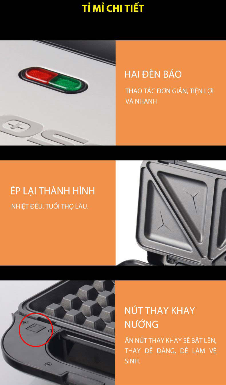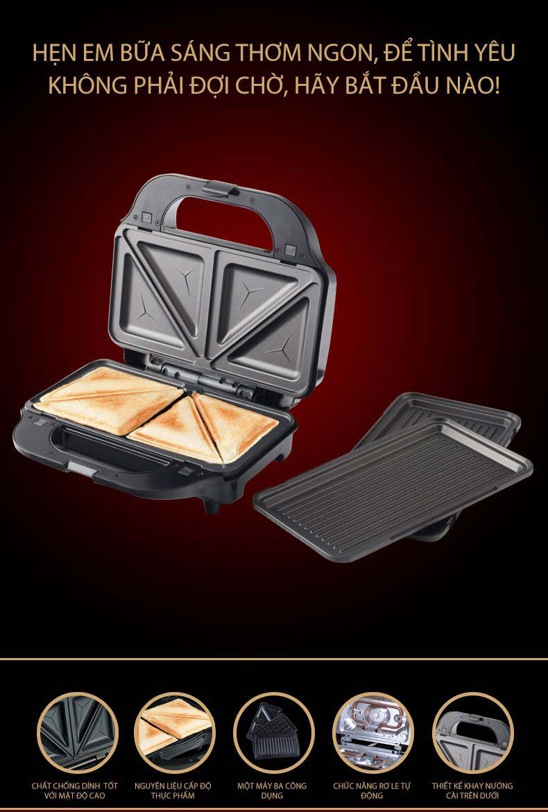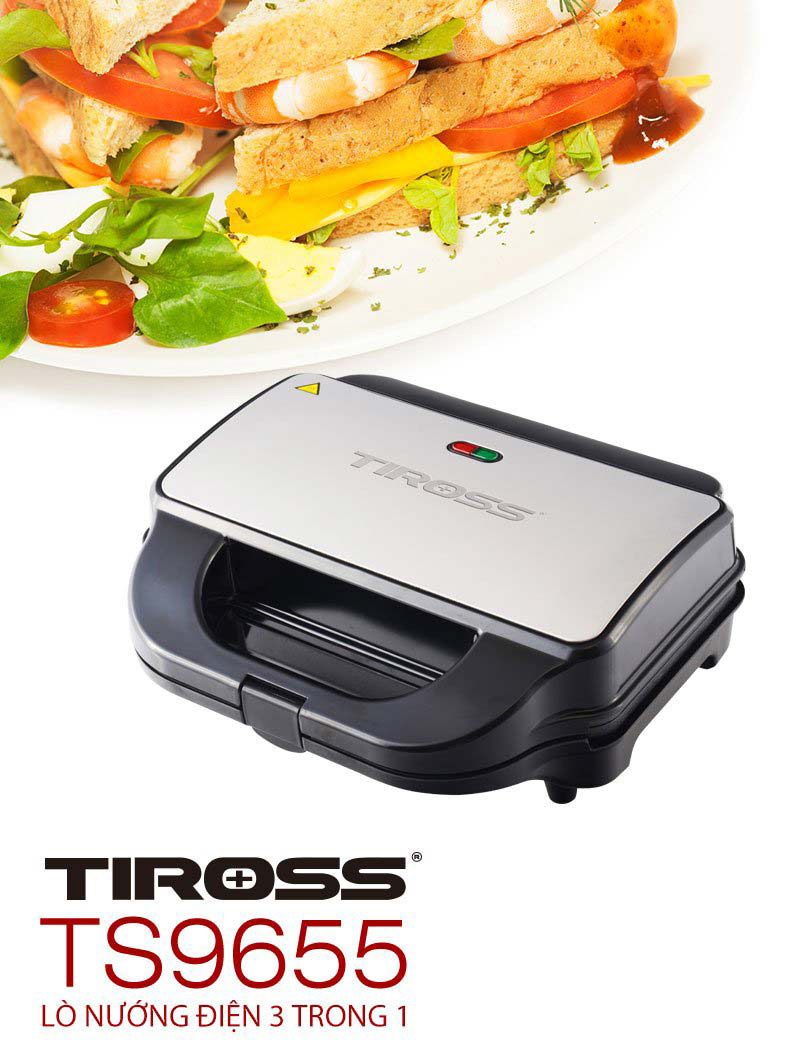 Thông tin sản phẩm Kẹp nướng bánh sandwich Tiross TS9669 có 3 chức năng: nướng bánh Sandwich, bánh mỳ kẹp, bánh Waffle. Với chất liệu bằng thép không gỉ, bọc bên ngoài bằng lớp nhựa chống nhiệt, chân máy cũng được trang bị đệm chống trượt an toàn. Chiếc máy này sẽ giúp bạn dễ dàng làm ra những chiếc bánh kẹp nóng hổi, thơm ngon và bổ dưỡng cho gia đình.     Ưu điểm kẹp nướng bánh Tiross TS9669 Kẹp nướng bánh sandwich Tiross TS9669 sở hữu công suất hoạt động lớn 750W, nhờ đó, bạn có thể làm một chiếc bánh trong thời gian ngắn hơn với lớp vỏ ngoài giòn tan và bên trong mềm mại. Đồng thời giúp bạn tiết kiêm thời gian và công sức so với việc nướng bánh truyền thống.   Máy đi kèm 3 khuôn khác nhau để phù hợp cho từng loại bánh, khuôn được phủ lớp chống dính hạn chế bột bánh bám dính gây cháy khét và việc lấy bánh ra khỏi khuôn cũng dễ dàng hơn. Khay có khả năng dẫn nhiệt tốt, tăng nhiệt độ nhanh và làm nóng đều, từ đó tiết kiệm chi phí nhiên liệu khi sử dụng.   Kẹp nướng bánh sandwich Tiross TS9669 còn được thiết kế hai đèn báo giúp bạn nhận biết lúc nào máy đã nướng xong. Sản phẩm được trang bị rơ le tự động tự ngắt khi quá tải vô cùng an toàn. Khay nướng được thiết kế cài trên dưới đảm bảo không gây thoát nhiệt, giúp tiết kiệm điện năng một cách tối ưu.