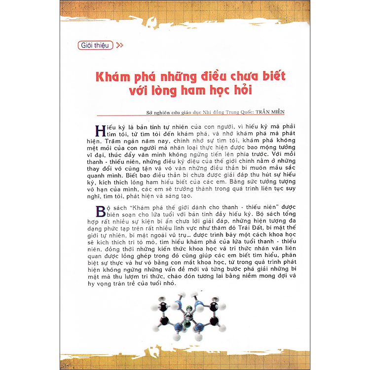 Bộ sách: "Bộ sách Khám Phá Thế Giới dành cho Thanh - Thiếu Niên: Khám Phá Bí Ẩn Về Khoa Học" được biên soạn cho lứa tuổi với bản lĩnh đầy hiếu kỳ. Bộ sách tổng hợp rất nhiều sự kiện bí ẩn chưa lời giải đáp, những hiện tượng đa dạng phức tạp trên rất nhiều lĩnh vực như thăm dò Trái đất, bí mật thế giới tự nhiên, bí mật ngoài vũ trụ được trình bày một cách khoa học và tri thức nhân văn liên quan được lồng ghép trong đó cũng giúp các em biết tìm hiểu, phân biệt sự thực và hư vô bằng con mắt khoa học, từ trong quá trình phát hiện không ngừng những vấn đề mới và từng bước phá giải những bí mật mà thu lượm tri thức, chào đón tương lai bằng niềm mong đợi và hy vọng tràn trề của tuổi nhỏ .