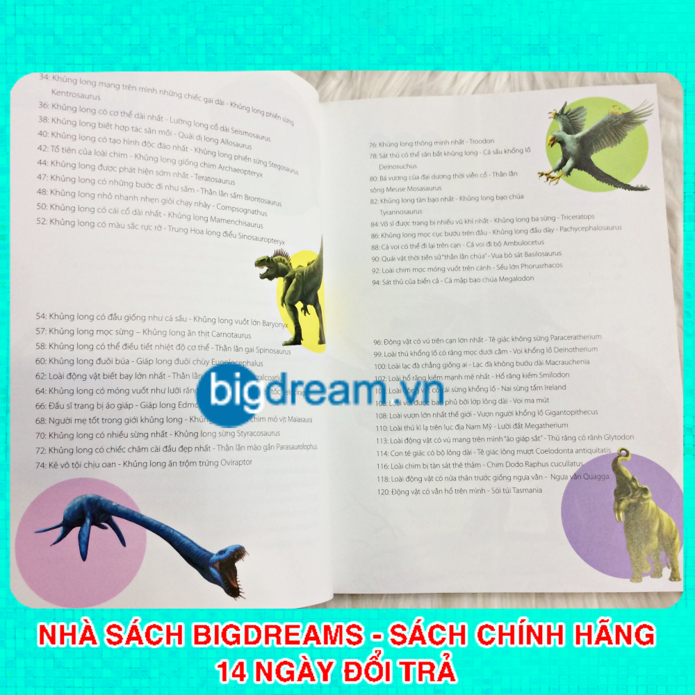 Sách - Khám Phá Thế Giới Động Vật Kì Thú - Thế giới của các loài đã tuyệt chủng - Kiến thức bách khoa cho trẻ Giới thiệu sơ lược hình thức và nội dung: Sách khoa học phổ biến kiến thức về động vật phù hợp cho các bạn nhỏ từ 3 tuổi đam mê khám phá thế giới xung quanh Sách giới thiệu nhiều loài động vật độc đáo, đại diện cho các chi họ động vật khác nhau từ thời tiền sử đến nay Khám Phá Thế Giới Động Vật Kì Thú - Thế giới của các loài đã tuyệt chủng như một bảo tàng động vật Từ 3.5 tỷ năm trước, sự sống bắt đầu xuất hiện trên Trái đất. Tiếp theo đó, vô vàn sinh vật mới ra đời, cũng vô số sinh vật vì lí do này lí do kia mà tuyệt chủng hoàn toàn. Sự tiến hóa của sinh vật cũng trải qua quá trình dài đằng đẵng từ đơn giản đến phức tạp, từ dưới nước đến trên cạn, từ thấp đến cao. Trong quá trình đó, từng có 500 triệu sinh vật sống trên trái đất, nhưng 99% trong số đó đã tuyệt chủng. Trong quá trình đó, tuyệt diệt hay sinh tồn đều quan trọng như nhau. Có sự tuyệt chủng của loài này thì mới có không gian cho loài khác ra đời. 600 triệu năm trước, từ khi động vật đa bào xuất hiện, trái đất đã trải qua năm cuộc đại tuyệt chủng. Năm cuộc đại tuyệt chủng đó, chủ yếu do thảm họa địa chấn hoặc biến đổi khí hậu gây ra. Tốc độ tuyệt chủng của các loài diễn ra từ từ. Ví dụ như loài chim cứ 300 năm mới có một giống tuyệt chủng, còn loài thú phải đến 8000 năm mới có một giống tuyệt chủng. Tuy nhiên kể từ khi nhân loại bước vào xã hội công nghiệp, can thiệp sâu rộng vào tự nhiên, thì tốc độ tuyệt chủng bị đẩy nhanh nhiều so với trước. Trong 400 năm gần đây, số lượng giống loài tuyệt chủng được ghi vào hồ sơ đủ khiến người ta kinh hãi: 120 giống thú và 250 giống chim đã không còn tồn tại nữa. Hơn nữa, sự tuyệt chủng này vẫn đang diễn ra với tốc độ ngày càng cao. Chúng là lời cảnh báo đối với sự sống cũng như chất lượng sống trên toàn bộ hành tinh này. Đến nay, trên thế giới đang có 593 giống chim, hơn 400 giống thú, 209 động vật bò sát lưỡng cư và hơn 20 nghìn thực vật cao cấp khác đang đối diện với nguy cơ tuyệt chủng Sách phân loại một cách khoa học, giới thiệu chi tiết về đặc điểm ngoại hình, tập tính, phân bố của từng loại động vật, phù hợp với nhu cầu và kiến thức của trẻ Toàn bộ hình minh họa của bộ sách được vẽ tay, tạo không gian sống động giúp trẻ kích thích thị giác và trí tò mò của trẻ Bộ sách không chỉ hữu ích với trẻ mà còn là cẩm nang gỡ bí cho ba mẹ, để ba mẹ không còn bị bối rối bởi những câu hỏi của con cái về thế giới động vật như: Loài khủng long nào thông minh nhất? Loài vật nào có nhiều mắt nhất? Loài vật nào là “thích khách” của đại dương? Loài vật nào dám đối đầu với cá nhà táng? Loài chim nào không mọc cánh?... Thông qua việc đọc sách cùng con, ba mẹ khơi gợi sự quan tâm đến kiến thức thế giới tự nhiên, kích thích sự nhiệt tình khám phá thế giới, tăng tình yêu và ý thức bảo vệ các loài động vật trên Trái Đất. Giúp bé trở thành một em bé có vốn hiểu biết sâu rộng trong nhiều lĩnh vực Thông tin chi tiết: - Nhà xuất bản: Nhà Xuất Bản Phụ Nữ - Tác giả: Lưu Tiểu Hàm, Trương Tùng - Màu sắc: Nhiều màu - Loại bìa: Bìa mềm - Số trang: 122 trang - Kích thước: 26 x 18.5 cm Nhà sách BIGDREAMS - Sách hay cho Mẹ và Bé cam kết với khách hàng: 100% sách chính hãng 100% sách mới nguyên vẹn 100% đơn hàng được TẶNG giấy hướng dẫn cách đọc sách cho Bé 100% sách được đóng gói cẩn thận 100% hỗ trợ trả hàng - hoàn tiền nếu sách không giống hình ảnh và mô tả