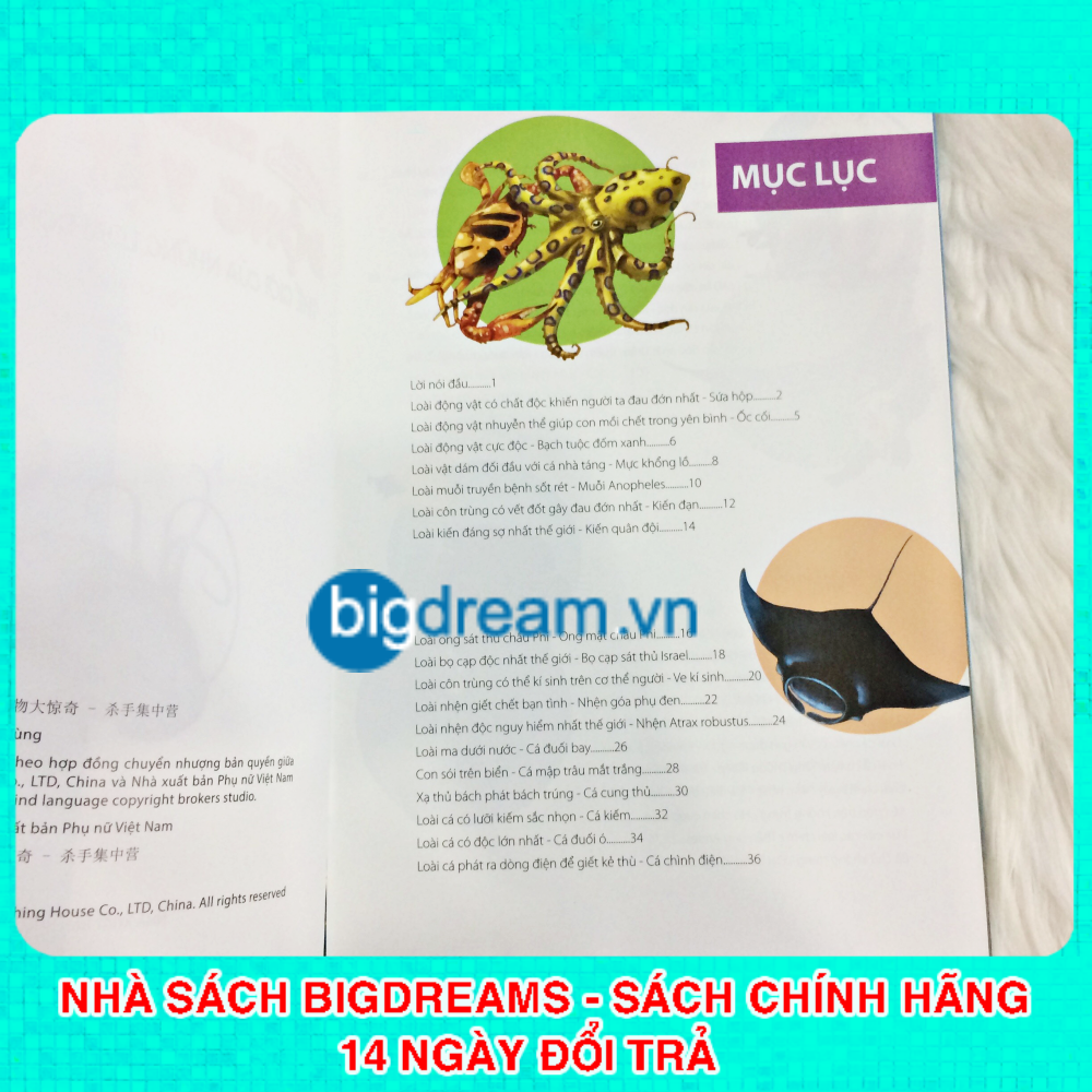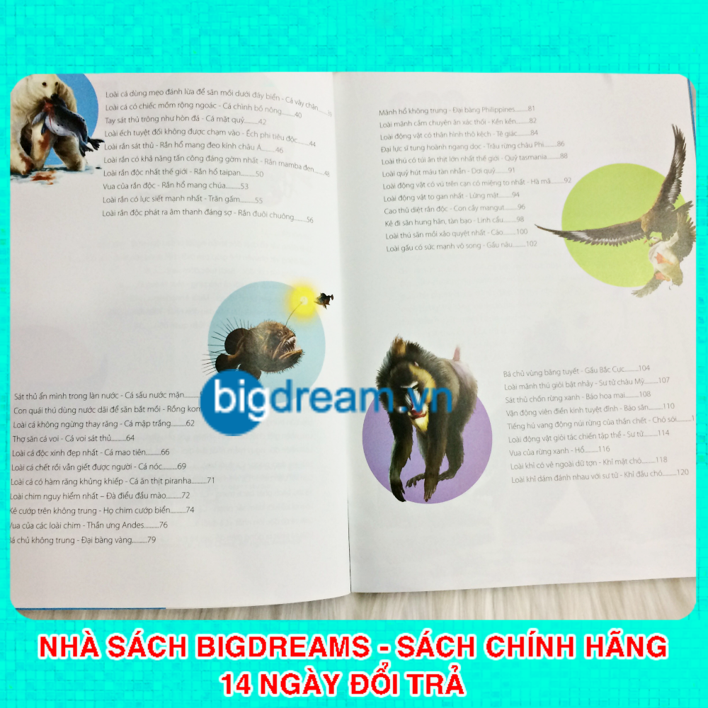Sách - Khám Phá Thế Giới Động Vật Kì Thú - Thế giới của những loài động vật sát thủ - Kiến thức bách khoa cho trẻ    Giới thiệu sơ lược hình thức và nội dung: Sách khoa học phổ biến kiến thức về động vật phù hợp cho các bạn nhỏ từ 3 tuổi đam mê khám phá thế giới xung quanh Sách giới thiệu nhiều loài động vật độc đáo, đại diện cho các chi họ động vật khác nhau từ thời tiền sử đến nay Khám Phá Thế Giới Động Vật Kì Thú - Thế giới của những loài động vật sát thủ như một bảo tàng động vật với các loài vật săn mồi hàng đầu... Sách phân loại một cách khoa học, giới thiệu chi tiết về đặc điểm ngoại hình, tập tính, phân bố của từng loại động vật, phù hợp với nhu cầu và kiến thức của trẻ Toàn bộ hình minh họa của bộ sách được vẽ tay, tạo không gian sống động giúp trẻ kích thích thị giác và trí tò mò của trẻ Bộ sách không chỉ hữu ích với trẻ mà còn là cẩm nang gỡ bí cho ba mẹ, để ba mẹ không còn bị bối rối bởi những câu hỏi của con cái về thế giới động vật như: Loài khủng long nào thông minh nhất? Loài vật nào có nhiều mắt nhất? Loài vật nào là “thích khách” của đại dương? Loài vật nào dám đối đầu với cá nhà táng? Loài chim nào không mọc cánh?... Thông qua việc đọc sách cùng con, ba mẹ khơi gợi sự quan tâm đến kiến thức thế giới tự nhiên, kích thích sự nhiệt tình khám phá thế giới, tăng tình yêu và ý thức bảo vệ các loài động vật trên Trái Đất. Giúp bé trở thành một em bé có vốn hiểu biết sâu rộng trong nhiều lĩnh vực    Thông tin chi tiết: - Nhà xuất bản: Nhà Xuất Bản Phụ Nữ - Tác giả: Nhiều tác giả - Màu sắc: Nhiều màu - Loại bìa: Bìa mềm - Số trang: 122 trang - Kích thước: 26 x 18.5 cm    Nhà sách BIGDREAMS - Sách hay cho Mẹ và Bé cam kết với khách hàng:  100% sách chính hãng  100% sách mới nguyên vẹn  100% đơn hàng được TẶNG giấy hướng dẫn cách đọc sách cho Bé  100% sách được đóng gói cẩn thận  100% hỗ trợ trả hàng - hoàn tiền nếu sách không giống hình ảnh và mô tả