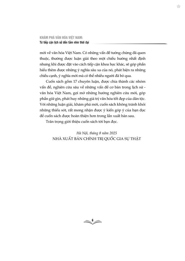 Cuốn sách “Khám phá văn hóa Việt Nam: Từ tiếp cận lịch sử đến tầm nhìn thời đại” gồm 17 chuyên luận, được chia thành các nhóm vấn đề cơ bản trong lịch sử văn hóa Việt Nam, gợi mở những hướng nghiên cứu mới, góp phần giữ gìn, phát huy những giá trị văn hóa tốt đẹp của dân tộc. Trân trọng giới thiệu cuốn sách tới bạn đọc!