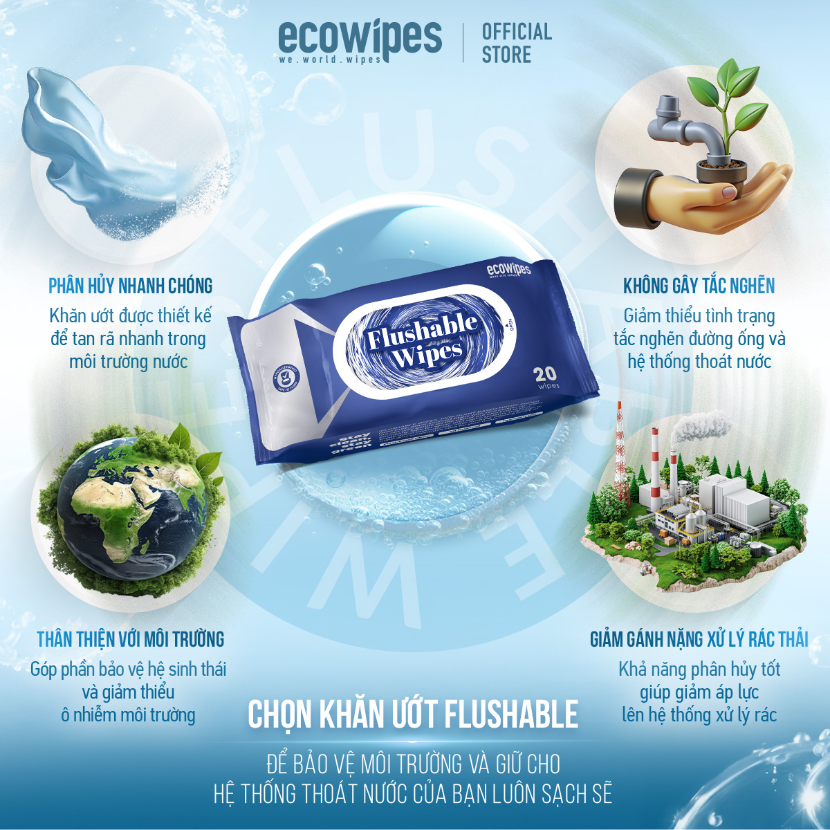 Bạn đang tìm kiếm một giải pháp vệ sinh tiện lợi cho túi xách, balo hay những chuyến đi ngắn ngày? Khăn ướt phân hủy trong nước Flushable Wipes 20 tờ chính là lựa chọn hoàn hảo dành cho bạn! Sản phẩm được làm từ 100% sợi thực vật tự nhiên, không chứa nhựa, không gây kích ứng da – an toàn cho cả gia đình và thân thiện với môi trường. Dù nhỏ gọn nhưng vẫn được ứng dụng công nghệ flushable phân hủy nhanh, có thể xả trực tiếp vào toilet mà không lo tắc nghẽn hay ảnh hưởng đến hệ thống xử lý nước thải. Chọn Flushable Wipes 20 tờ là chọn sự tiện lợi trong từng khoảnh khắc, và vẫn giữ trọn tinh thần sống xanh mỗi ngày!   MÔ TẢ SẢN PHẨM: ️Sản xuất tại: Việt Nam. ️Quy cách đóng gói: 1 gói 20 tờ ️Chất liệu vải: Vải tan trong nước ️Kích thước: 150 x 200 mm ️Ngày sản xuất: Xem trên bao bì ️Hạn sử dụng: 3 năm kể từ ngày sản xuất.   CÔNG DỤNG: ️Khăn ướt Flushable Wipes là giải pháp làm sạch nhanh chóng và tiện lợi, phù hợp để sử dụng cho cả gia đình với khả năng làm sạch nhẹ nhàng sau khi đi vệ sinh. ️Tiện lợi trong các tình huống không có nước rửa tay hoặc khi di chuyển. ️Lau sạch các vật dụng hằng ngày ️Khăn tan nhanh trong nước, không gây tắc nghẽn hệ thống. ️Dễ dàng mang theo khi du lịch, dã ngoại, hoặc làm việc.   ƯU ĐIỂM: ️100% từ sợi thực vật thuần tự nhiên: Khăn ướt Flushable Wipes được làm hoàn toàn từ sợi thực vật tự nhiên, không chứa nhựa, đảm bảo an toàn cho người sử dụng và không gây hại đến môi trường. ️Có thể thả trực tiếp vào toilet: Có thể thả trực tiếp vào toilet, mang lại sự tiện lợi tối ưu cho người dùng. ️Phân hủy nhanh chóng sau khi xả: Sản phẩm có khả năng tan nhanh trong nước sau khi xả, giảm nguy cơ tắc nghẽn đường ống và bảo vệ hệ thống xử lý nước thải. ️An toàn cho môi trường: Lựa chọn bền vững, đồng hành cùng cuộc sống xanh, góp phần bảo vệ môi trường sống xung quanh chúng ta.   THÀNH PHẦN: ️Vải tan trong nước ️Hơn 99% nước tinh khiết, dịu nhẹ cho làn da nhạy cảm của em bé. ️Chiết xuất lô hội, vitamin E   ĐẶC BIỆT: ️Sản phẩm được kiểm định và cấp chứng nhận chất lượng bởi tiêu chuẩn QCVN. ️Chất liệu vải có thể tan nhanh trong nước ️Sản xuất trên dây chuyền hiện đại tại nhà máy EcoWipes đạt chuẩn GMPc và ISO 9001:2015.   HƯỚNG DẪN SỬ DỤNG: ️Mở miếng decal dán trên mặt sản phẩm. ️Rút khăn cần sử dụng. ️Sau khi sử dụng, dán miếng decal lại để giữ ẩm và tránh nhiễm khuẩn.   BẢO QUẢN: ️Bảo quản nơi khô ráo thoáng mát, tránh ánh nắng trực tiếp.   LƯU Ý:   CHÍNH SÁCH ĐỔI TRẢ: "TRẢ HÀNG NẾU KHÔNG HÀI LÒNG!"   DỊCH VỤ TẬN TÂM - BẢO MẬT TUYỆT ĐỐI: ️Sản phẩm thân thiện môi trường ️Giá cả hợp lý so với chất lượng ️Giao hàng cẩn thận, nhanh chóng ️Đổi trả dễ dàng, miễn phí ️Hoàn tiền nếu không hài lòng ️Xuất hóa đơn theo yêu cầu ️Bảo mật thông tin tuyệt đối