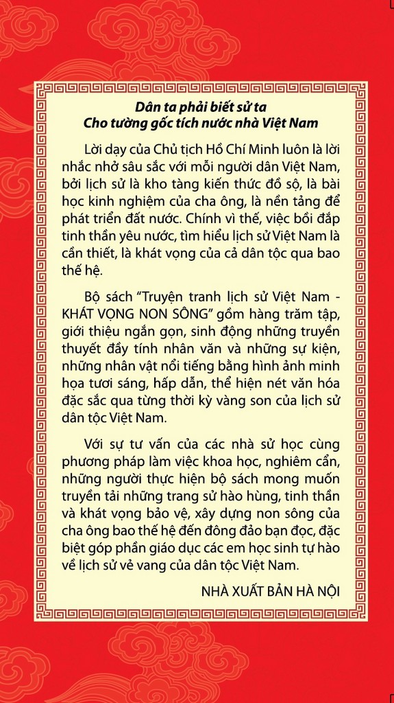 Bộ sách “Truyện tranh lịch sử Việt Nam – Khát vọng non sông” gồm hàng trăm tập, giới thiệu ngắn gọn, sinh động những truyền thuyết đầy tính nhân văn và những sự kiện, những nhân vật nổi tiếng trong lịch sử hàng nghìn năm của dân tộc Việt Nam. Thần đồng Mạc Đĩnh Chi – Ông là một nhân vật lịch sử nổi tiếng thời n hà Trần, vốn có tư chất thông minh hơn người mà còn có nghị lực vươn lên trong cuộc sống, ông được vua Trần Anh Tông thăng làm Thái học sinh dũng thủ, sung chức Nội thư gia, có nhiều cống hiến lớn lao cho sự hưng thịnh của vương triều, là tấm gương sáng về sự hiếu học cho người đời sau noi theo.