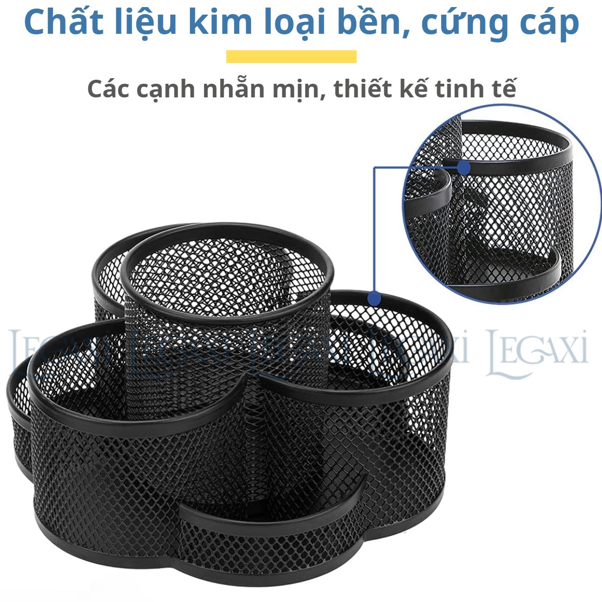 GIỚI THIỆU SẢN PHẨM - Là sản phẩm đa năng phù hợp với nhiều đối tượng người dùng khác nhau từ học sinh, sinh viên, nhân viên văn phòng và những người nội trợ,… - Khay bút được làm gia công từ chất liệu Kim loại cứng chắc, có độ bền cao, cho thời gian sử dụng lâu dài. - Bề mặt bên ngoài được mạ lớp sơn, vừa có tác dụng chống gỉ sét vừa tạo tính thẩm mỹ cho sản phẩm. THÔNG TIN SẢN PHẨM - Kích thước: + Khay 4 ngăn:17.5 x 17.5 x 10.8 xcm - Chất liệu: Kim Loại - Khối lượng: 296 gram - Bề mặt ngoài là dạng lưới thông thoáng. CÔNG DỤNG Ngoài việc đựng bút và các dụng cụ học tập, sản phẩm có thể chứa các vật phẩm nhỏ gọn như trang sức, đồ trang điểm, thun cột tóc, ghim, băng đô, kẹp, muỗng, đũa nĩa,… ƯU ĐIỂM - Khay bút xoay 360 độ. Sản phẩm quay trơn tru từ bên này sang bên , xoay chuyển theo chiều hướng, bạn luôn có thể tìm thấy vật dụng mình cần sử dụng nhanh chóng trong ngăn. - Nhiều ngăn giúp để được nhiều vật dụng khác nhau - Khay bút có khả năng chịu lực, độ bền cao. - Sản phẩm đẹp, tinh tế giúp góc học tập, làm việc chuyên nghiệp gọn gàng, sang trọng . - Khay đựng đồ dùng vô cùng tiện lợi để đựng bút, điện thoại, chìa khóa, remotetivi, đồ trang điểm, đồ dùng nhà bếp… vật phẩm nhỏ tránh bị thất lạc.