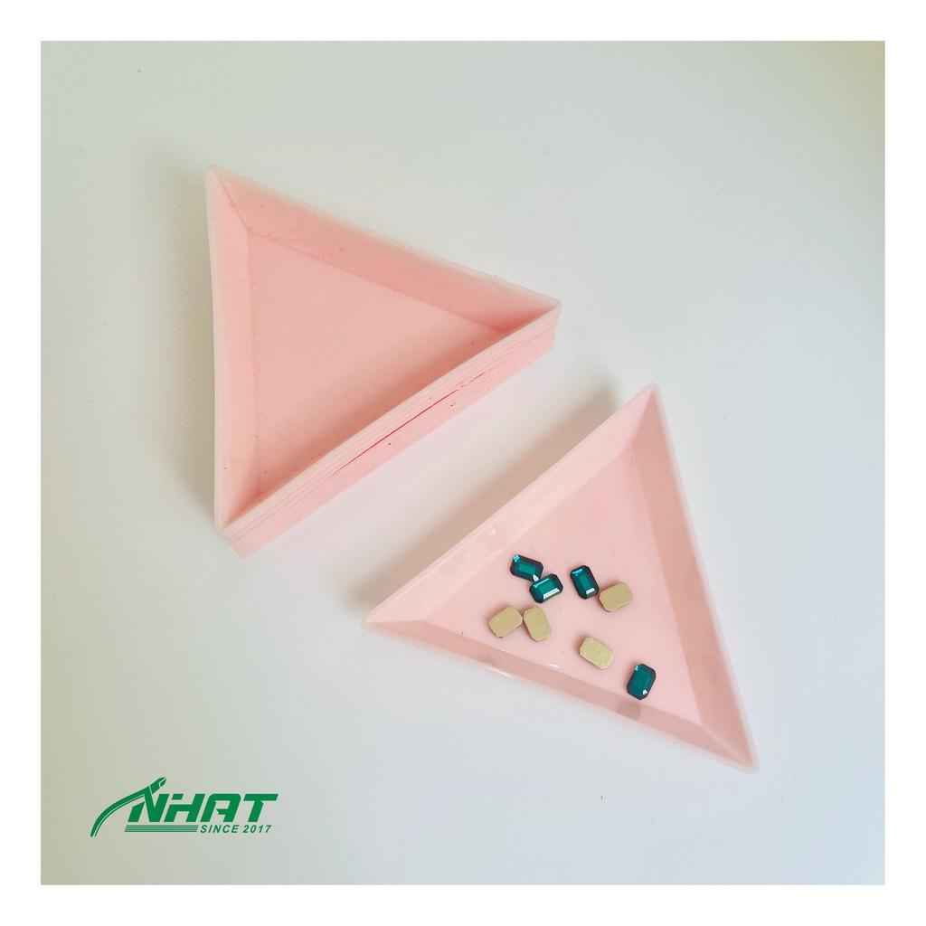 - Khay nhựa tam giác thường được các thợ nail để phía dưới khi đính đá, charm hoặc rắc đá, bi,để các hạt đá và bi thừa không bị rơi ra ngoài. Dễ dàng và tiện lợi cho việc thu gom những hạt đá, bi thừa này đổ lại vào hộp.