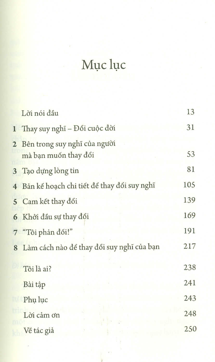 Chắc hẳn bạn biết rất nhiều người cần thay đổi điều gì đó trong cuộc sống của họ, nhưng dù bạn có cố gắng đến mấy, có ý tốt đến mấy, họ vẫn không chịu thay đổi. Bởi lẽ con người về cơ bản đều sợ thay đổi. Là một người kinh doanh, một người cha, một người bạn và cũng là một chuyên gia tư vấn, Rob Jolles hiểu rất rõ viễn cảnh ấy. Từ kinh nghiệm kinh doanh thành công và nhiều năm nghiên cứu, Rob Jolles đã đúc kết lại một công thức đơn giản giúp bạn dẫn dắt những người khác tự khám phá ra họ cần thay đổi những gì và vì sao. Có thể bạn muốn bán được hàng, cũng có thể bạn đang muốn cải thiện một mối quan hệ, dù có là gì thì những lời khuyên hữu ích của Jolles.