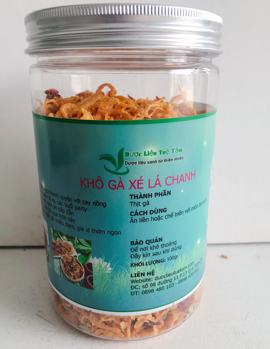 KHÔ GÀ XÉ LÁ CHANH THƯỢNG HẠNG Xuất xứ: Việt Nam. Hạn sử dụng: 12 tháng kể từ ngày sản xuất. Quy cách đóng gói: hủ nhựa pet cao cấp Khô gà lá chanh